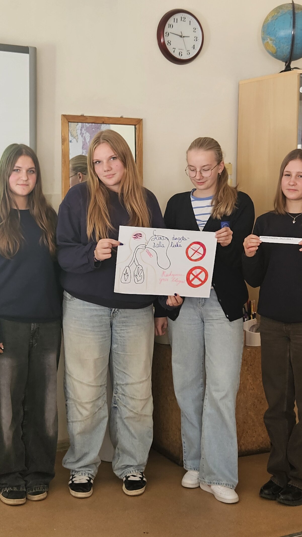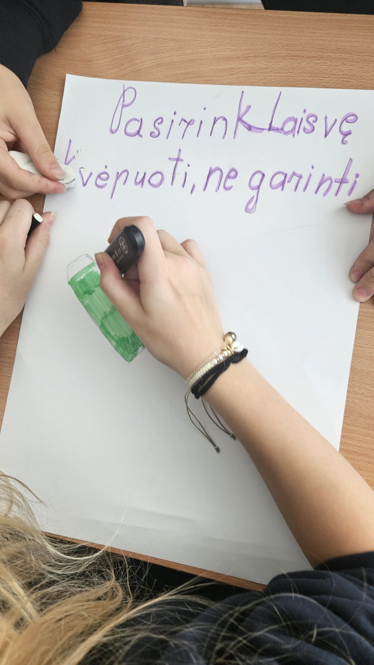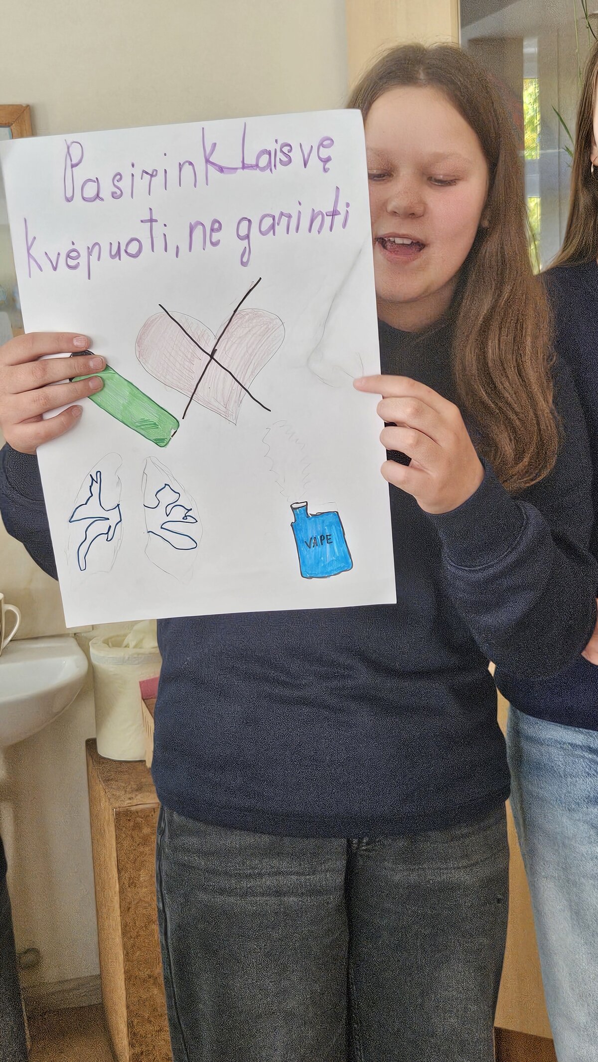 Siekiant įtvirtinti žinias, vyko trumpa viktorina, kurios metu mokiniai aktyviai atsakinėjo į klausimus. Antroje užsiėmimo dalyje mokiniai kūrė plakatus atspindinčius jų požiūrį į rūkymo ir garinimo žalą.