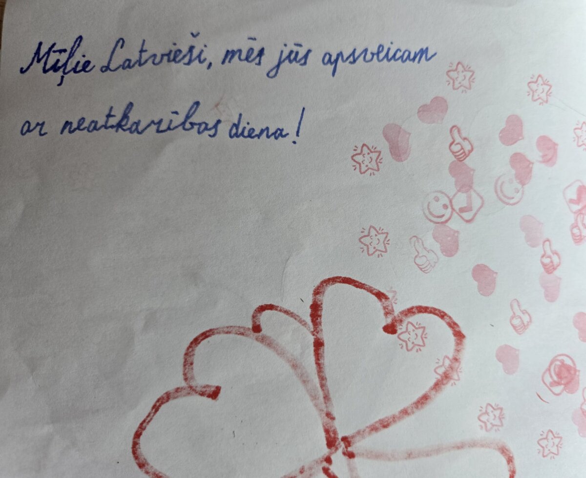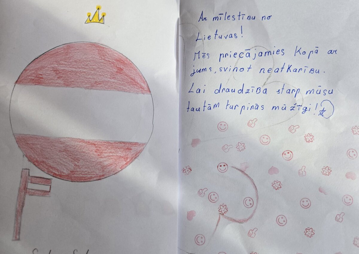 Pamokos metu vaikai kūrė sveikinimus, piešė Latvijos vėliavos spalvomis bei dalijosi mintimis apie kaimynystės svarbą ir tarpusavio pagarbą. 3a klasės mokiniai nuoširdžiai siunčia šilčiausius linkėjimus Latvijos žmonėms, linkėdami taikos, vienybės ir klestėjimo jų šaliai.