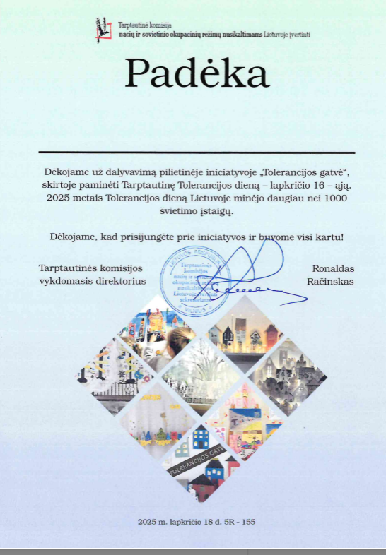 Šiaulių Dainų progimnazijos bendruomenė aktyviai prisijungė prie pilietinės iniciatyvos minint Tarptautinę Tolerancijos dieną