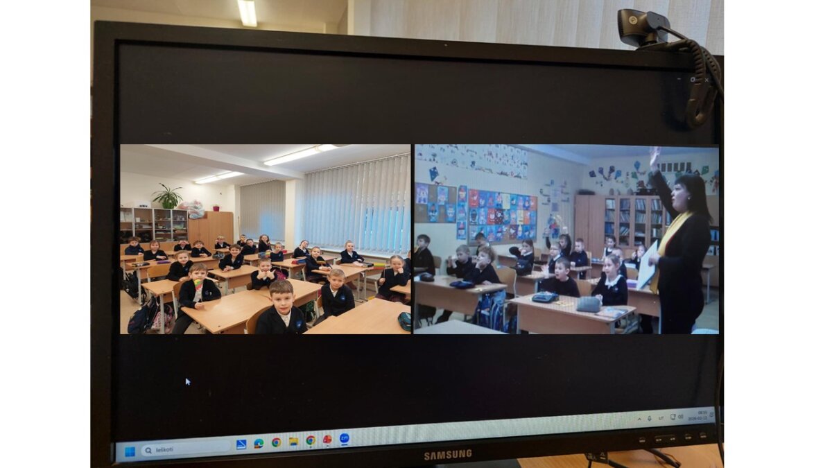 Nuotolinė pamoka tarp pirmokų iš Šiaulių ir Radviliškio miestų, skirta Lietuvos valstybės atkūrimo dienai