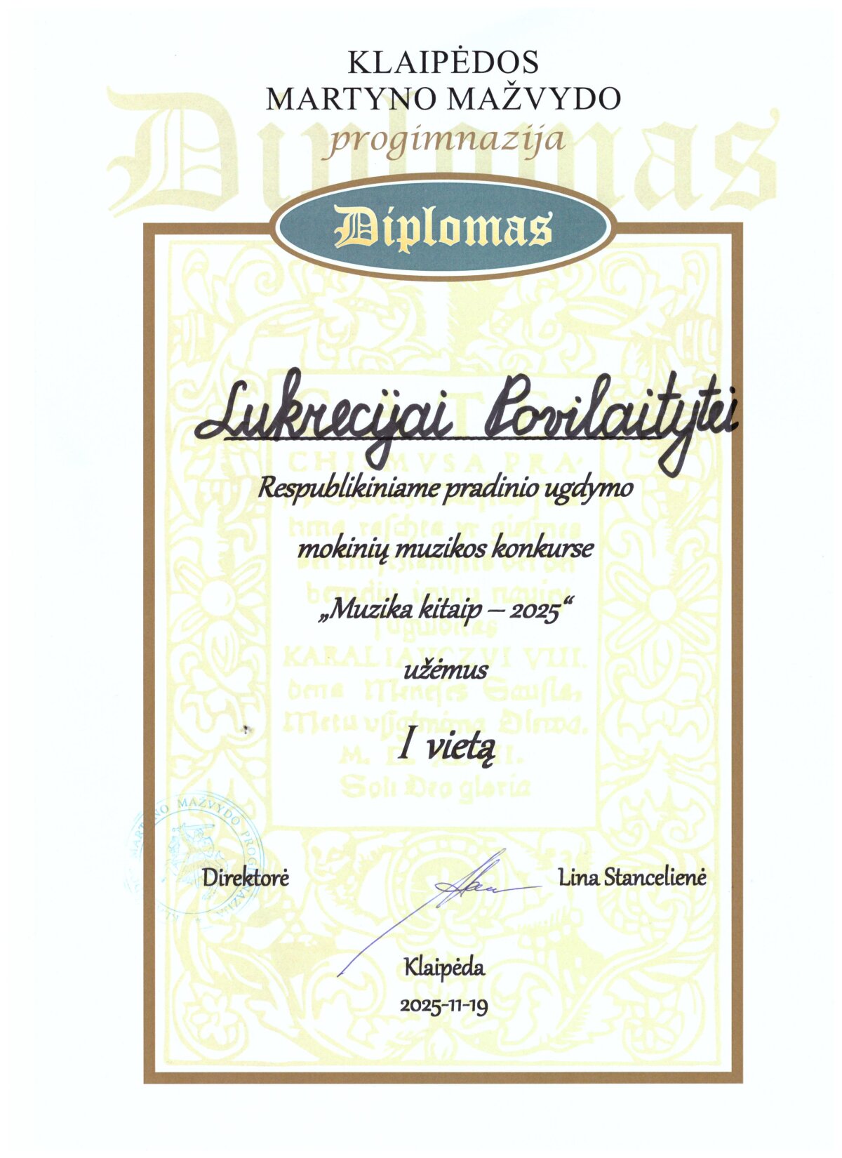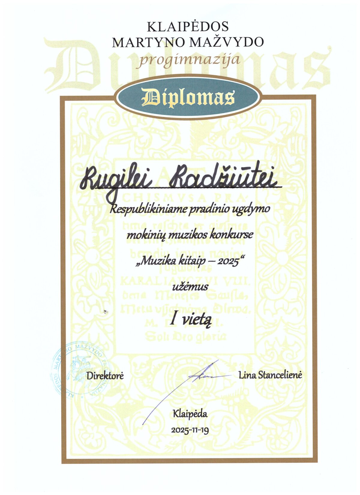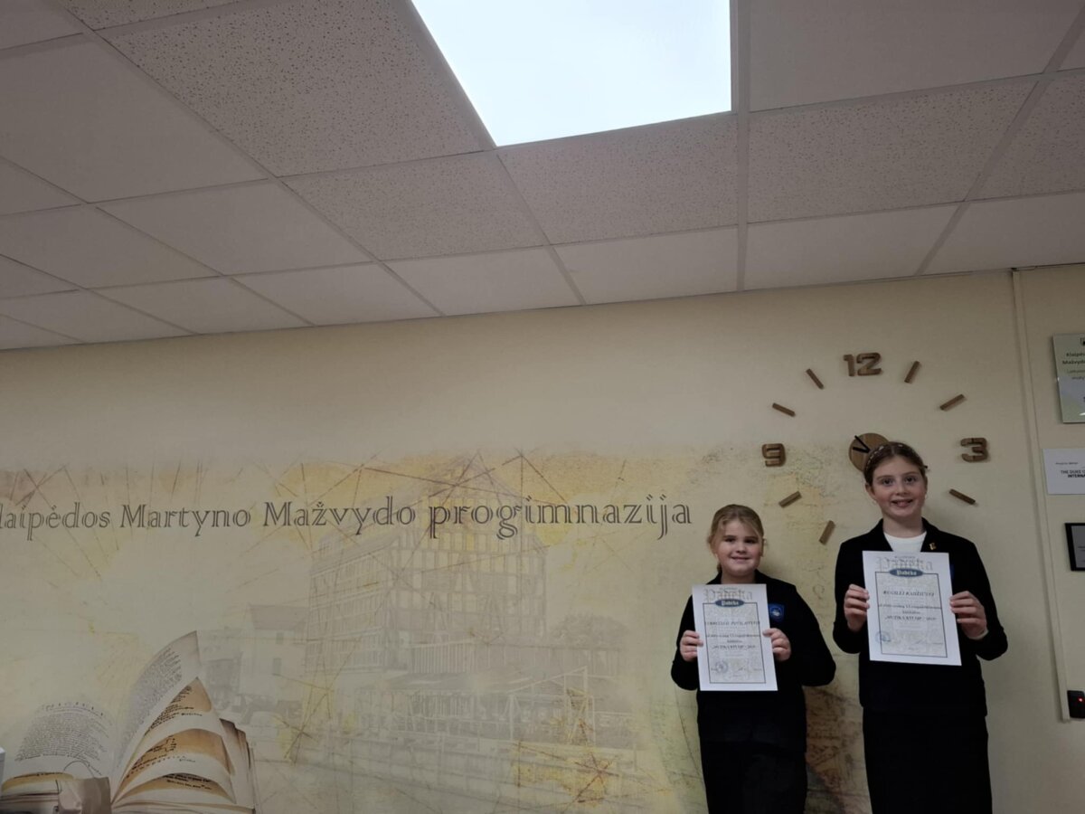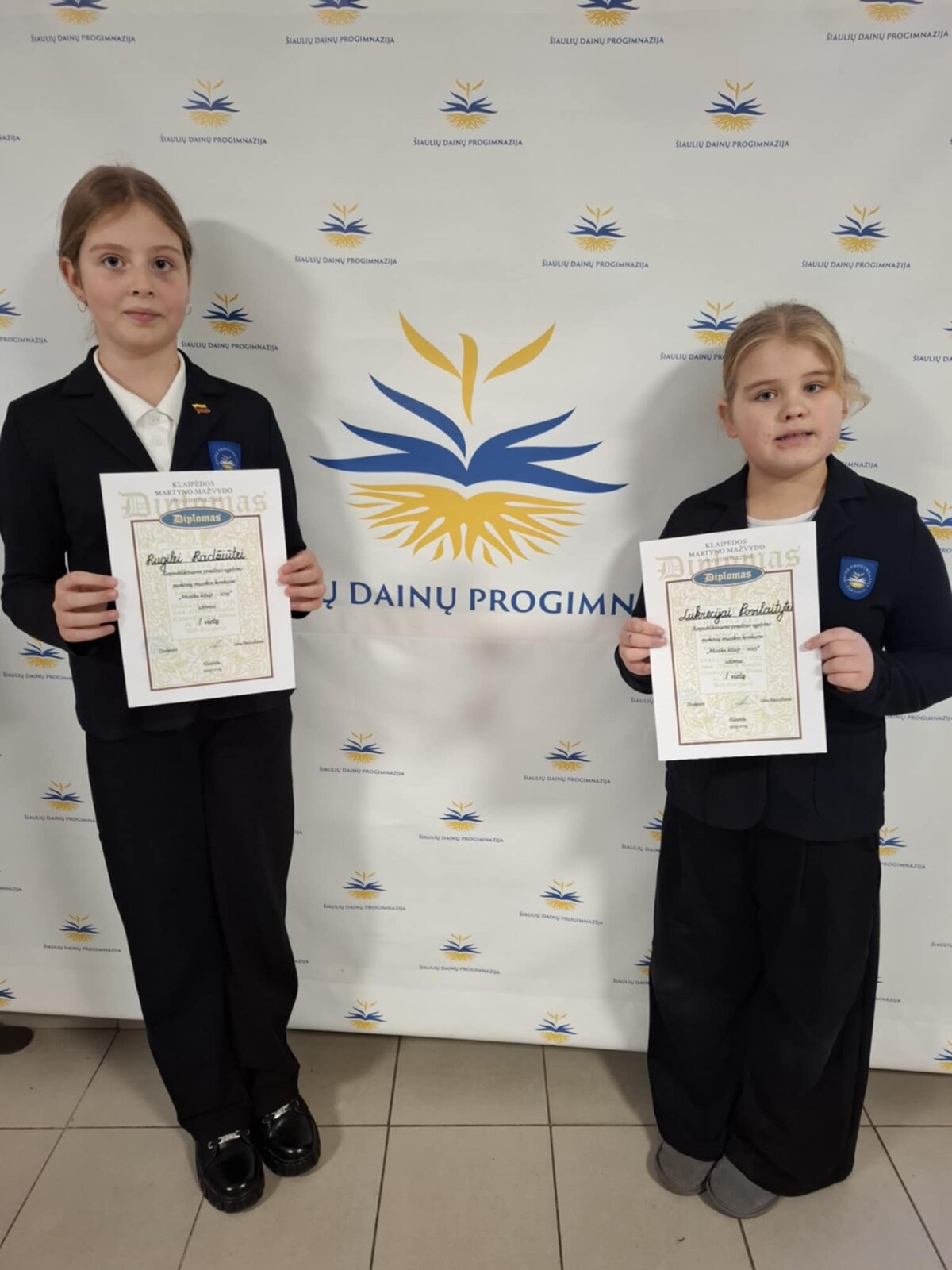 2025 m. lapkričio 19 d. Šiaulių Dainų progimnazijos 3d klasės mokinės Rugilė Radžiūtė ir Lukrecija Povilaitytė dalyvavo VI respublikiniame pradinio ugdymo mokinių muzikos konkurse ,,Muzika kitaip 2025“, kuris vyko Klaipėdos Martyno Mažvydo progimnazijoje. Konkurso tikslai – populiarinti muzikos dalyką, aktyvinti muzikinį bei kultūrinį gyvenimą, galimybė demonstruoti Įgytas žinias muzikos pamokų metu. Dalyviai atliko keturias užduotis: muzikinių terminų galvosūkio sprendimą, muzikinį ,,sudoku“ žaidimą, natų dailyraštį ir muzikinių terminų raidžių dėlionę. Už puikiai atliktas užduotis mokinės buvo apdovanotos I laipsnio diplomais. Mokines ruošė muzikos mokytoja Ingrida Jonavičienė ir pradinio ugdymo mokytoja Rasa Viliuvienė. Dėkojame mokinių tėveliams už bendravimą, bendradarbiavimą ir padėjimą pasiruošti konkursui. Didžiulė padėka Lukrecijos tėveliui už saugią ir šiltą kelionę į Klaipėdą ir atgal. Didžiuojamės ir sveikiname mokines!
