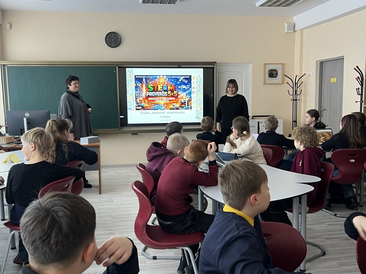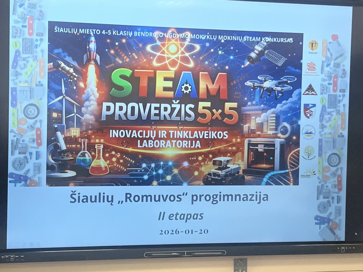 2026 m. sausio 20 d. Šiaulių „Romuvos“ progimnazijoje vyko Šiaulių miesto bendrojo ugdymo mokyklų 4–5 klasių mokinių STEAM konkurso „STEAM PROVERŽIS 5×5 – INOVACIJŲ IR TINKLAVEIKOS LABORATORIJA“ antrasis etapas.