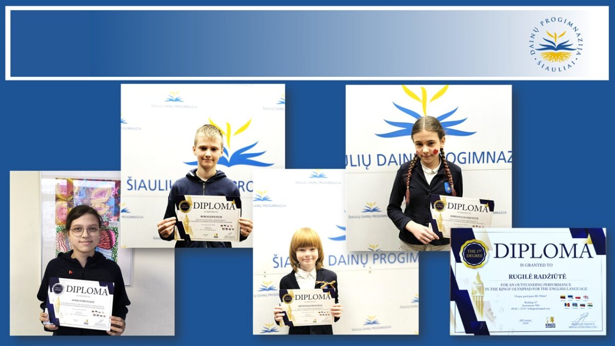 Mūsų mokiniai sėkmingai pasirodė KINGS olimpiadose ir pasiekė puikių rezultatų, kuriais nuoširdžiai didžiuojamės. Džiaugiamės K. Jankausku (4b kl.), R. Jaugeliu (5a kl.), A. Glodenyte (4e kl.) ir R. Radžiūte (3d kl.), pelniusiais I lygio diplomus anglų kalbos olimpiadoje, taip pat S. Ferensaite (5d kl.), kuri laimėjo II lygio diplomą.