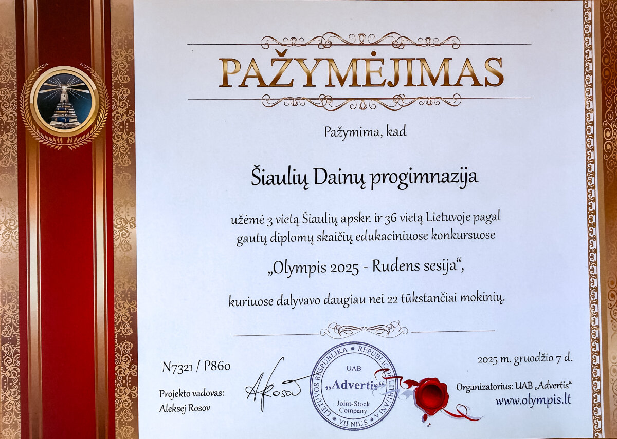 Puikūs rezultatai tarptautiniame konkurse „Olympis 2025 – Rudens sesijoje“