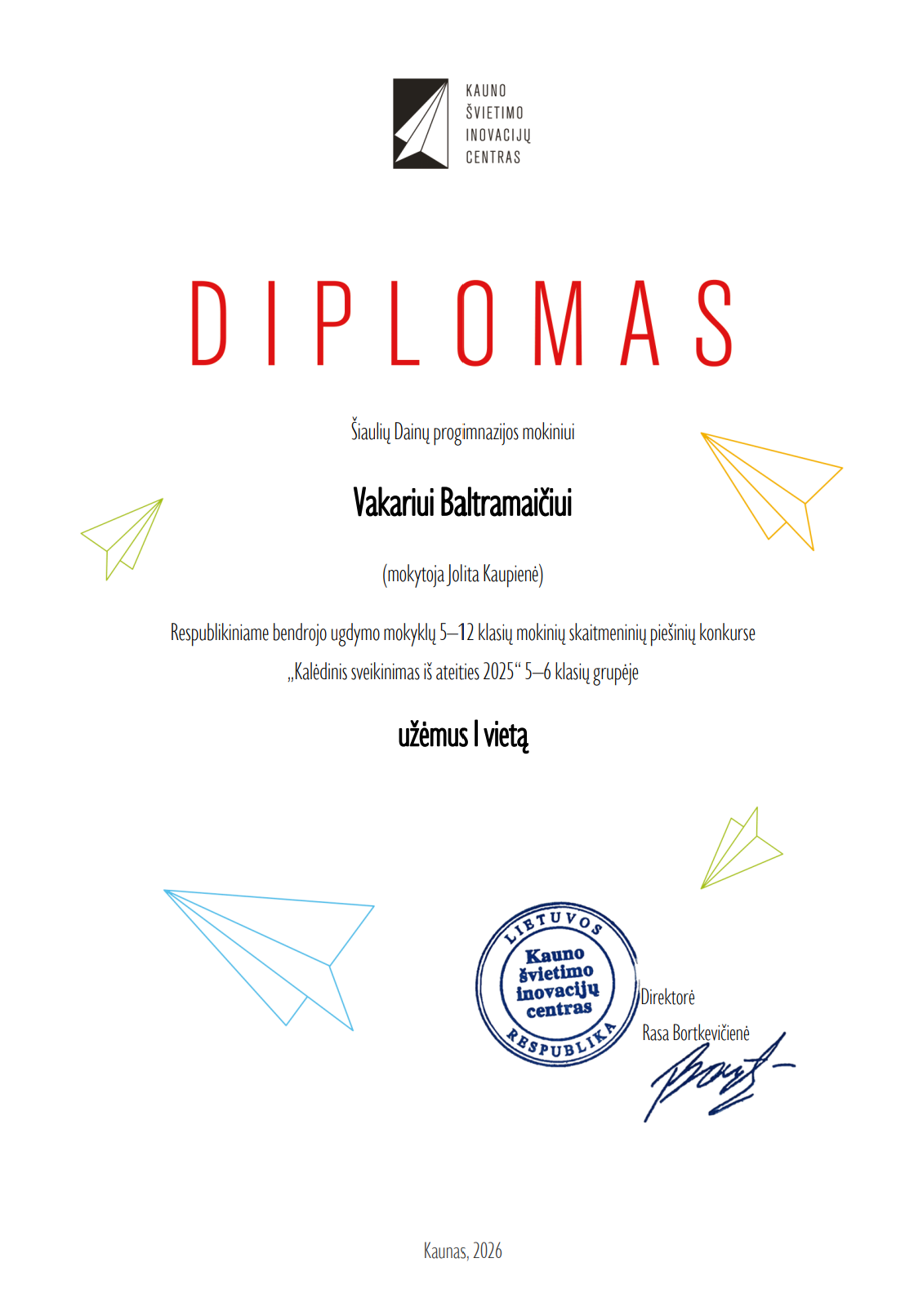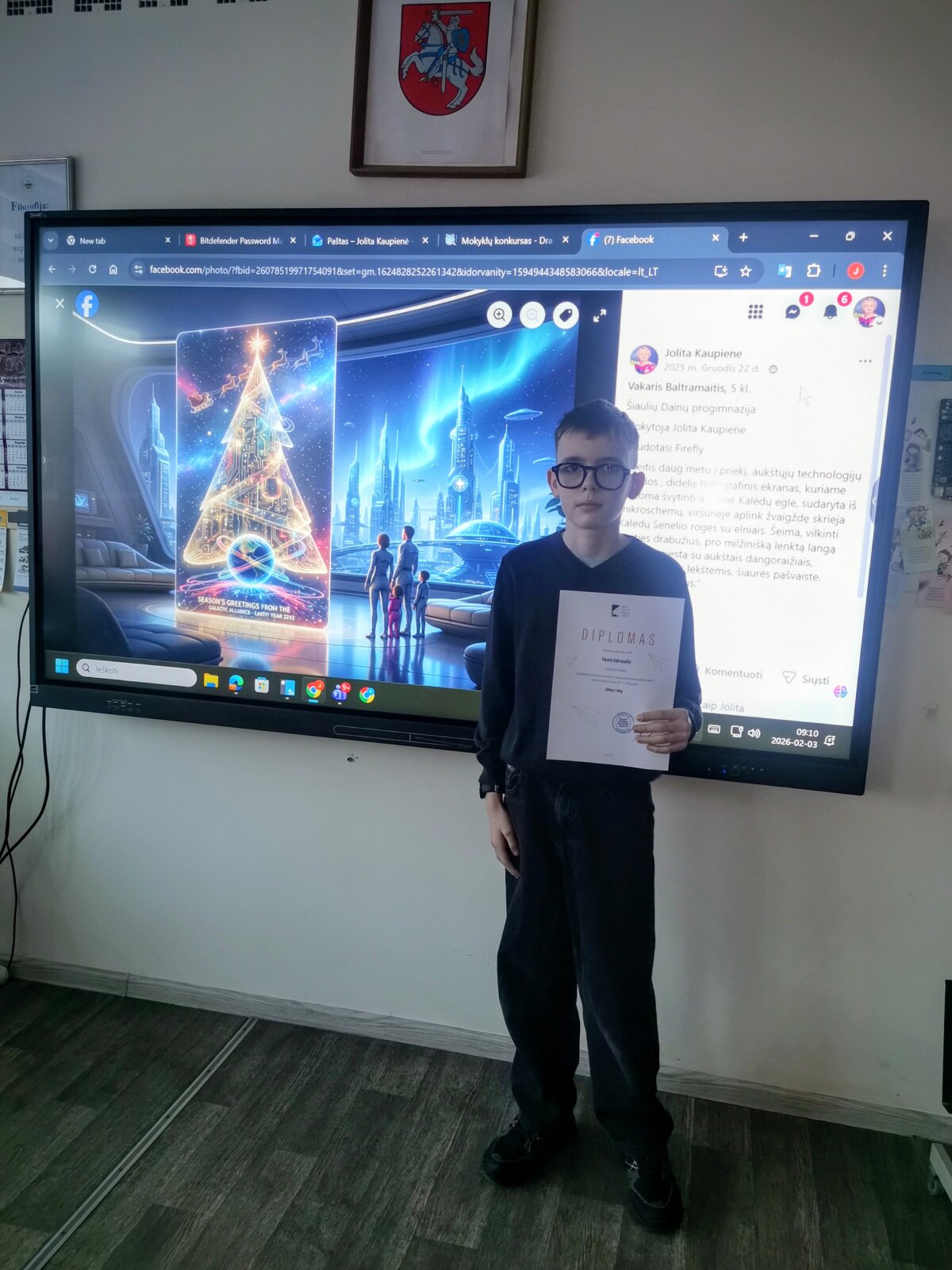 Šiaulių „Dainų“ progimnazijos vardas skambiai nuaidėjo antrajame respublikiniame 5–12 klasių mokinių konkurse „Kalėdinis sveikinimas iš ateities 2025“. Mūsų mokyklos penktos klasės mokinys Vakaris Baltramaitis 5c kl. savo amžiaus grupėje (5–6 klasės) pelnė I-osios vietos diplomą. Šiais metais konkursas išsiskyrė itin didele dalyvių gausa ir technologiniu pažangumu – mokiniai kūrė skaitmeninius piešinius, pasitelkdami dirbtinio intelekto (DI) programas. Vertinimo komisija peržiūrėjo beveik 450 darbų, atkeliavusių iš įvairių Lietuvos miestų ir rajonų: Vilniaus, Kauno, Klaipėdos, Zarasų ir kitų. Konkursą organizavo Kauno miesto informatikos mokytojų metodinis būrelis, Kauno „Vyturio“ gimnazija ir Kauno švietimo inovacijų centras.
