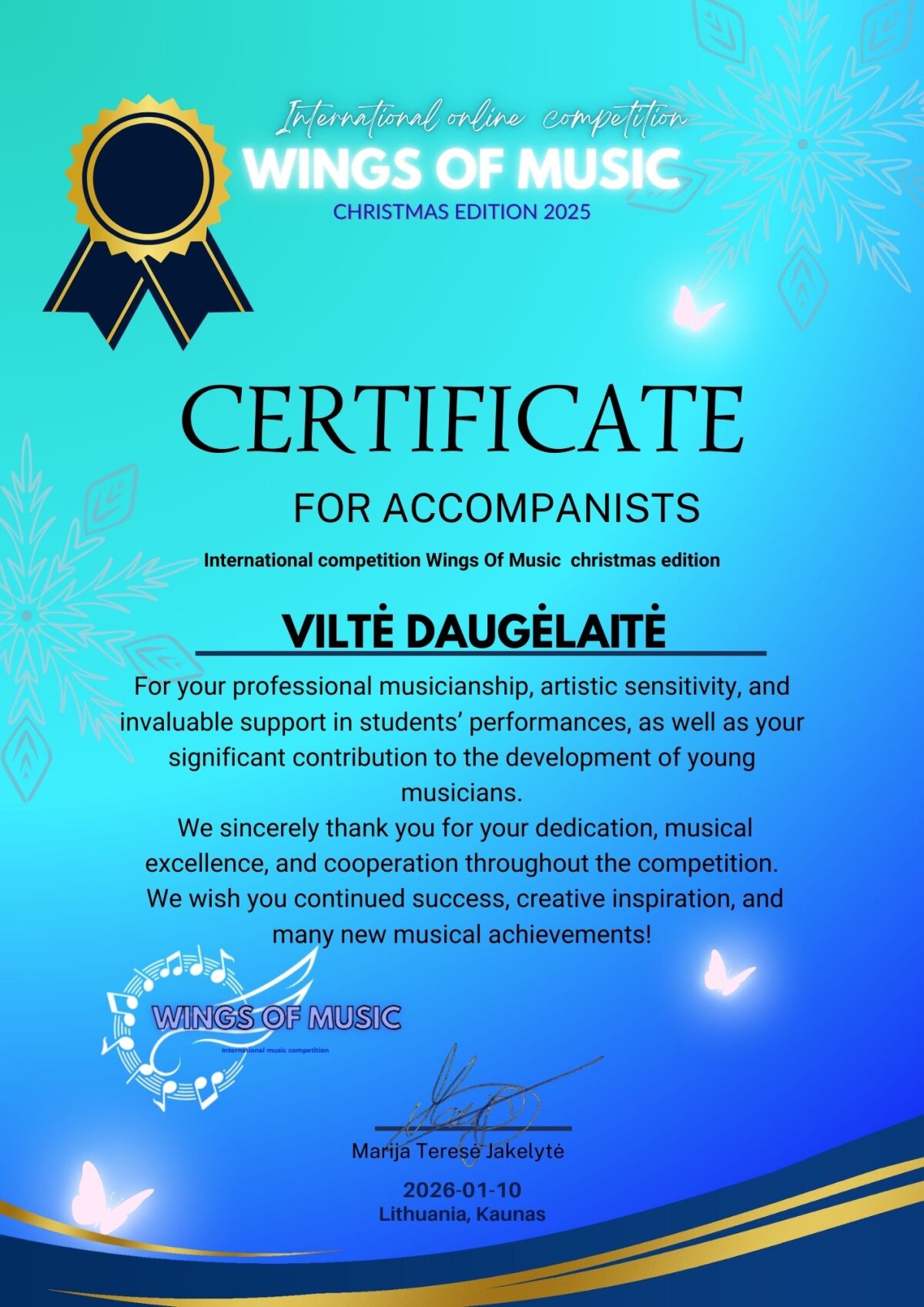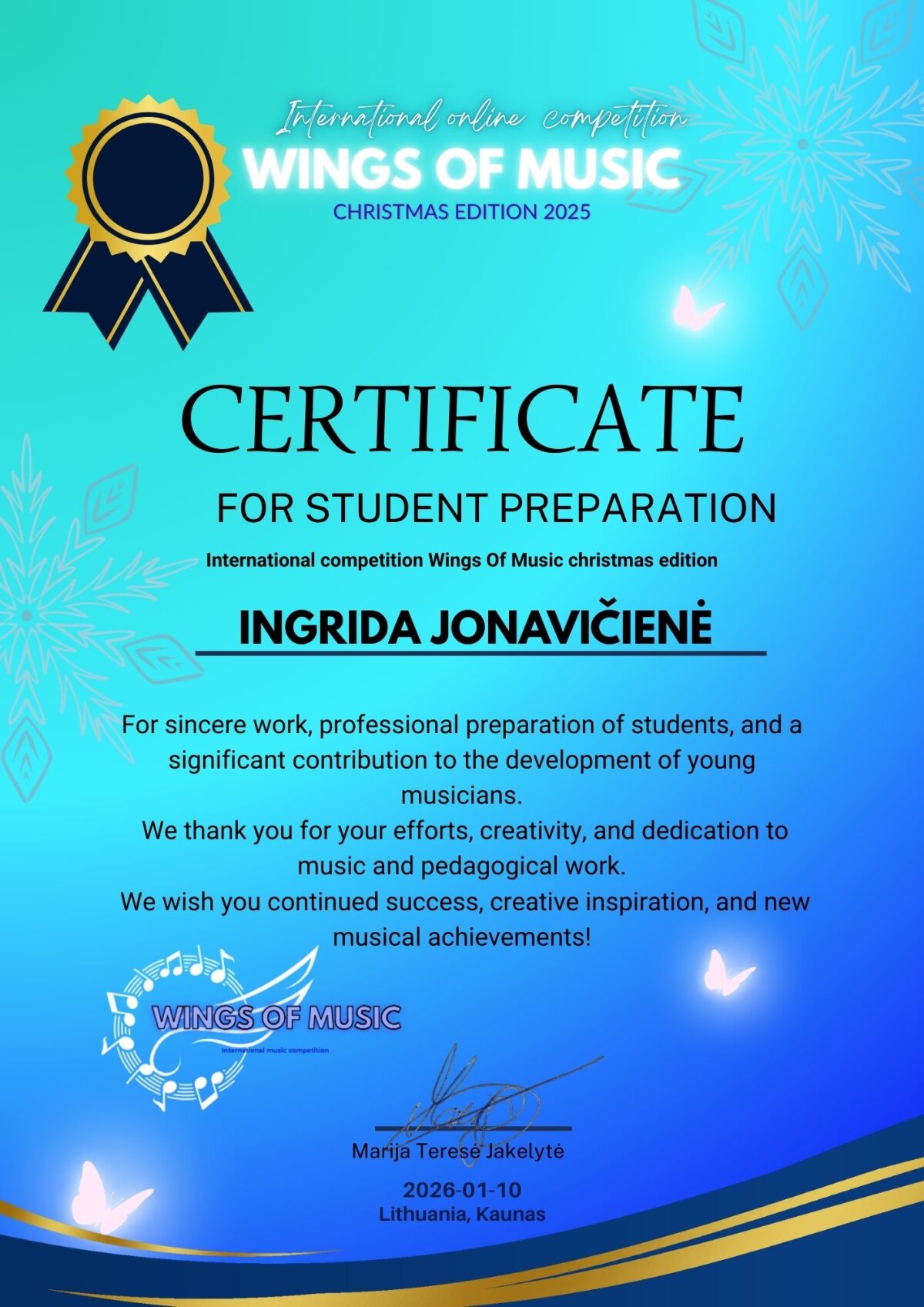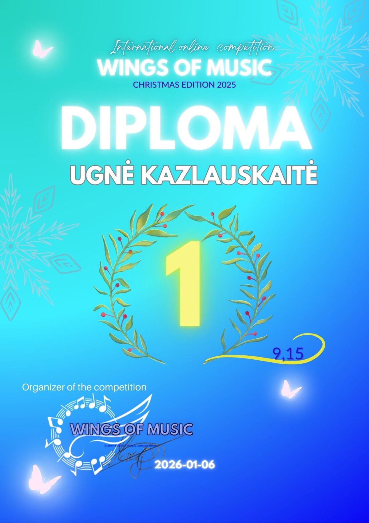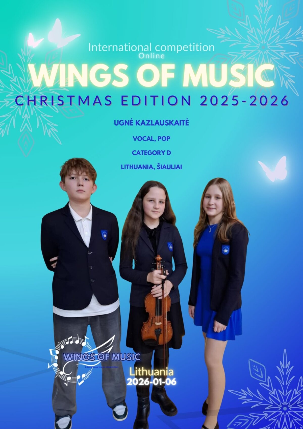 2026 m. sausio 6 d. Šiaulių Dainų progimnazijos dainavimo studijos ,,Vivo“ solistė Ugnė Kazlauskaitė (7d kl.) dalyvavo tarptautiniame instrumentalistų – vokalistų konkurse ,,Wings of music 2026“. Renginį organizavo VŠĮ ,,Gitarija“. Konkurso tikslas – atskleisti mokinių kūrybiškumą, meninį individualumą, atlikimo meistriškumą, estetinį skonį, užmegzti kūrybinius kontaktus, skatinti Lietuvos ir užsienio mokyklų mokinių ir jų mokytojų kūrybinį bendradarbiavimą. Konkurse dalyvavo daugelis Lietuvos ir užsienio atlikėjų. Už puikiai atliktą dainą dainavimo studijos solistė buvo apdovanota I laipsnio diplomu. Akompanavo 7d kl. mokiniai: Viltė Daugėlaitė (smuikas) ir Dmitrij Moldavancev (gitara). Mokinius ruošė muzikos mokytoja I. Jonavičienė. Sveikiname!