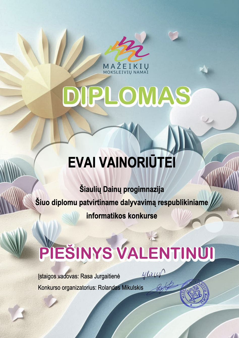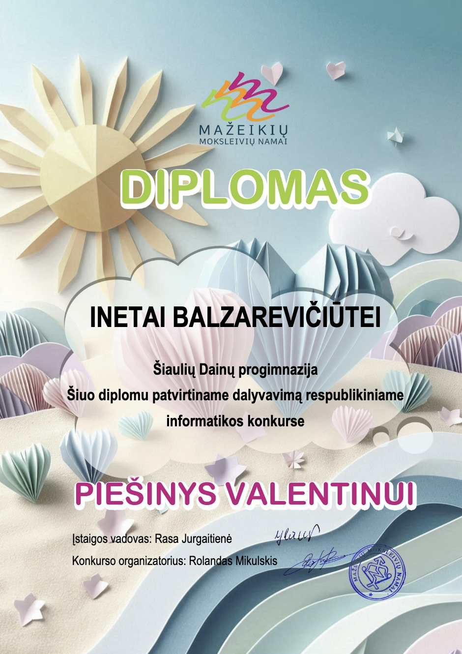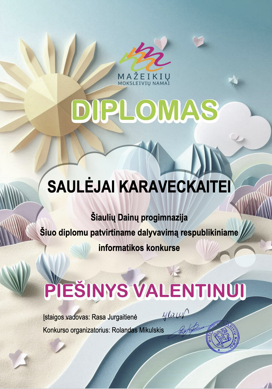 2026 m. vasario mėnesį vyko respublikinis grafikos ir meno informacinių technologijų konkursas „Piešinys Valentinui 2026“. Jo tikslas – ugdyti mokinių kompiuterinę kultūrą, skatinti kūrybiškumą, originalias idėjas bei stiprinti informacinių technologijų ugdymą mokyklose.