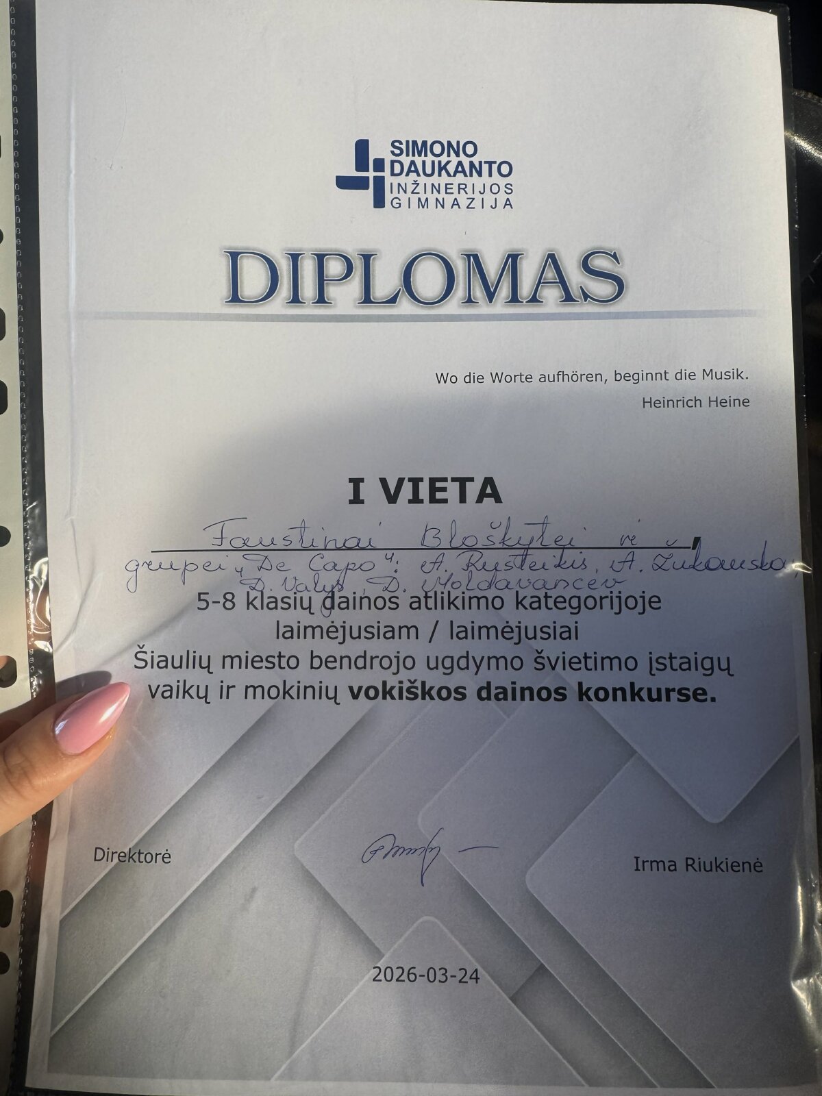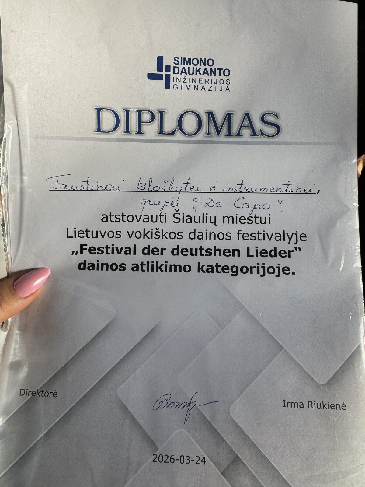 2026 m. kovo 24 d. Šiaulių Simono Daukanto inžinerijos gimnazijoje vyko vaikų ir mokinių vokiškos dainos konkursas. Šiaulių Dainų progimnazijai šiame renginyje atstovavo muzikos grupė „De Capo“ (muzikos mokytoja Simona Spranaitytė).