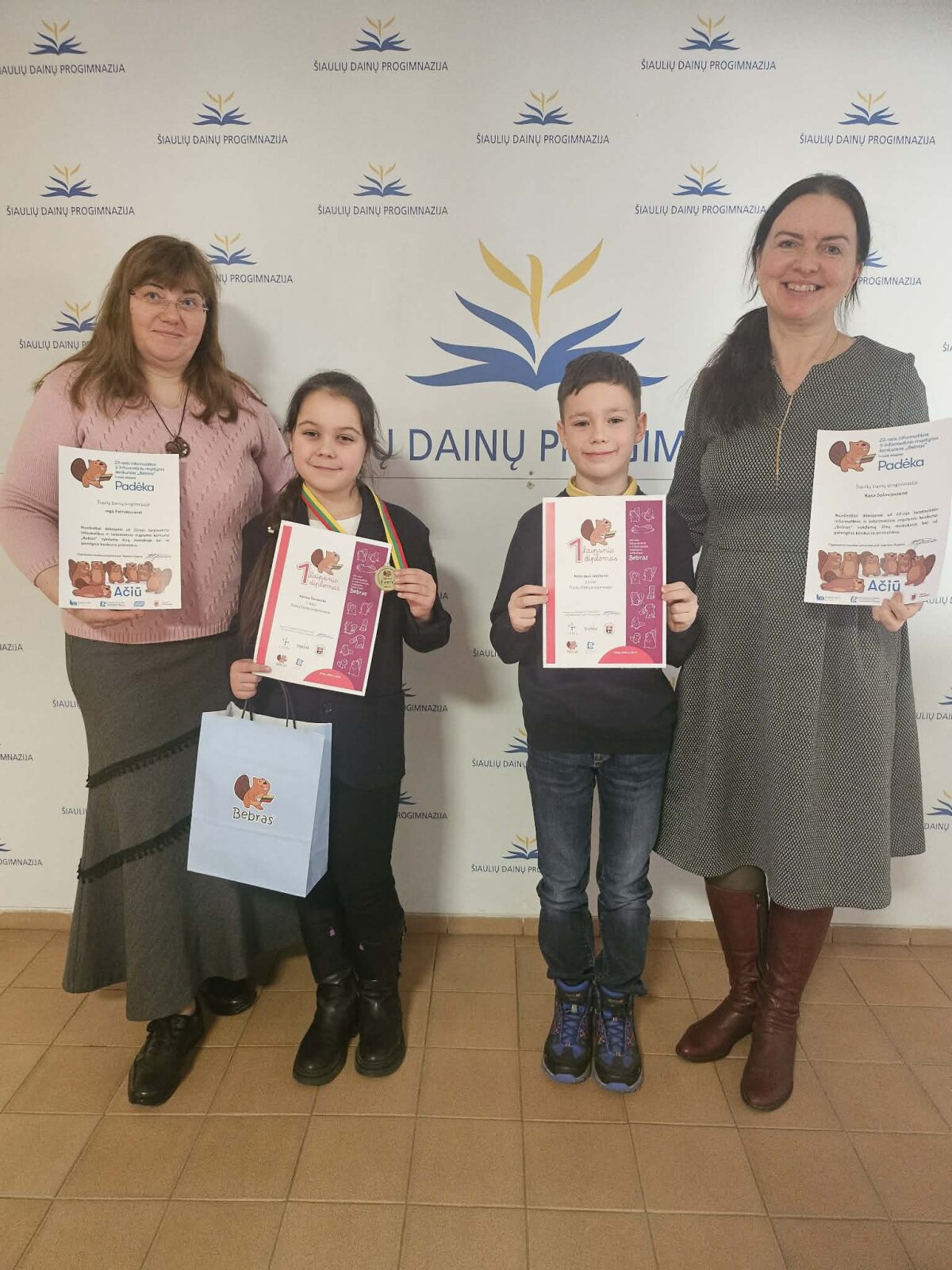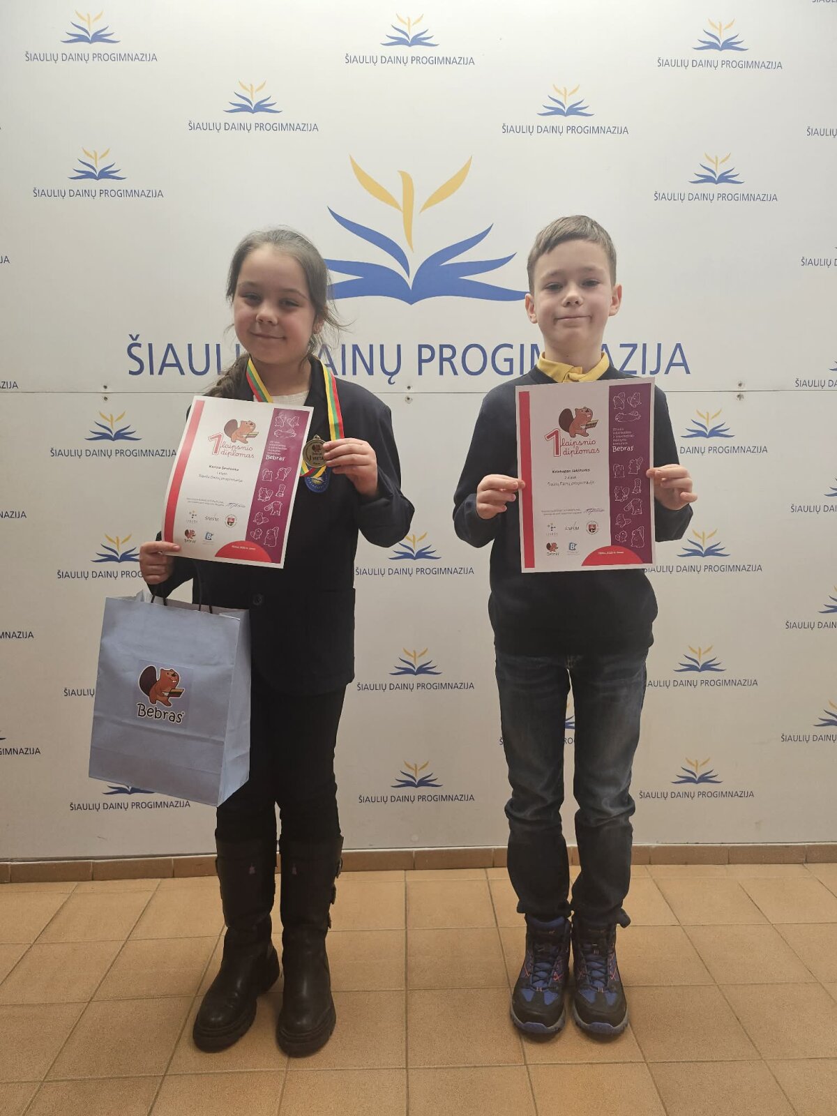 Ypač džiugu, kad tarp laureatų skambėjo ir Šiaulių Dainų progimnazija vardas. Mūsų mokykla įvertinta kaip viena gausiausiai konkurse dalyvavusių ugdymo įstaigų Lietuvoje. Padėka įteikta mokyklos direktorei Astai Vaičiūnienei, o šis įvertinimas dar kartą patvirtina didelį mokinių susidomėjimą informatikos pasauliu. Renginio metu apdovanoti pirmųjų vietų laimėtojai. Padėkos raštais ir medaliais džiaugėsi: Karina Ševčenko (1e klasė, mokytoja Inga Petrukonienė), Kristupas Jakštonis (2b klasė, mokytoja Rasa Solovjovienė). Šie pasiekimai įrodo, kad informatinis mąstymas sėkmingai ugdomas jau nuo pirmųjų klasių, o smalsumas ir noras spręsti logines užduotis atveria mokiniams kelius į ateities technologijas. Padėka už konkurso organizavimą ir mokinių parengimą taip pat įteikta informatikos mokytojai Jolitai Kaupienei.
