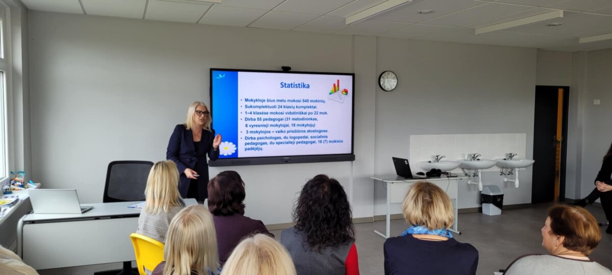 Stažuotės dalyviai turėjo galimybę susipažinti su „Šaltinio“ progimnazijos erdvėmis. Mokyklos direktorė Zina Stripeikienė akcentavo, kad progimnazijos kultūroje ypatingas dėmesys skiriamas mokinio pažinimui ir pažangai: sudaromos galimybės stiprinti akademinius pasiekimus dalykų konsultacijose, ugdomas emocinis raštingumas, skatinama mokytojo, mokinio lyderystė ir įgyvendinamas įtraukusis ugdymas.