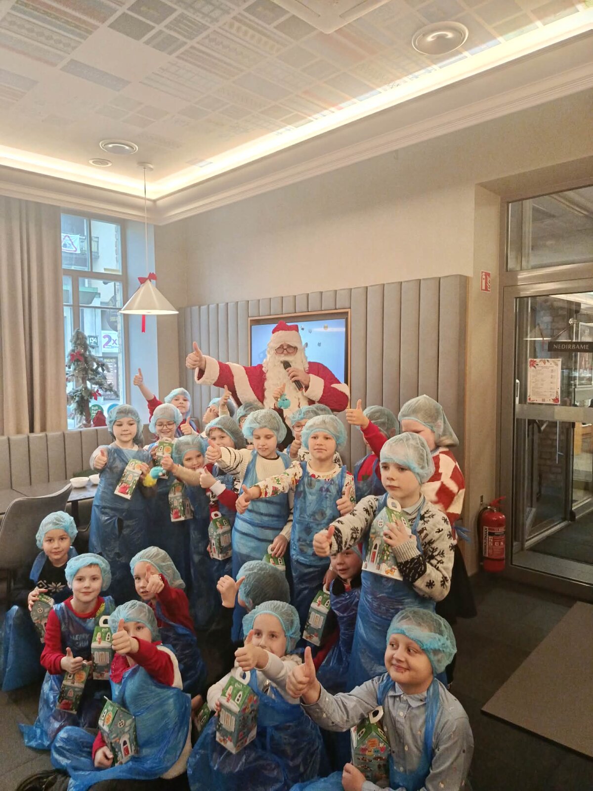 Po kūrybinių veiklų vaikai vaišinosi šilta kakava, o netrukus juos aplankė ir Kalėdų Senelis. Su juo pirmokai linksmai šoko, dainavo ir džiaugėsi artėjančiomis šventėmis. Kalėdų Senelis pažadėjo vaikams sniego ir patikino, kad dar kartą juos aplankys Kūčių vakarą.
