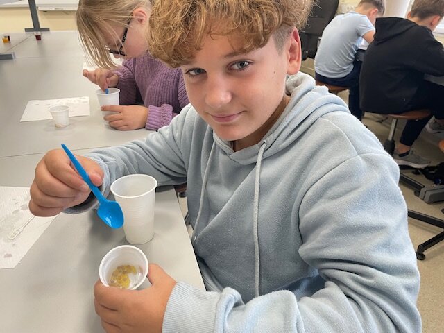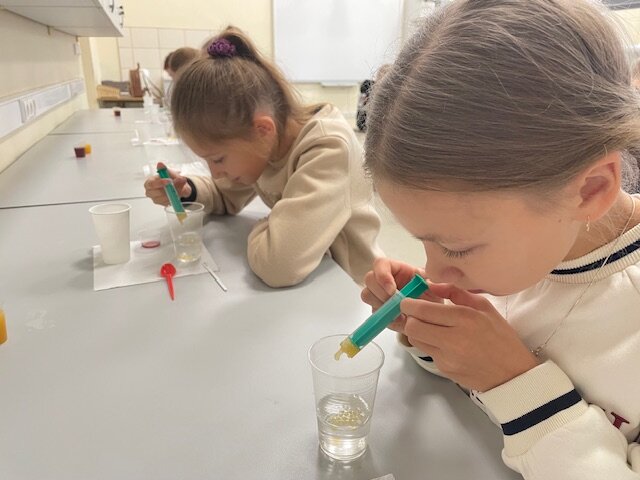 Chemijos laboratorijoje dainiečiai mokėsi, kaip maišant įvairias medžiagas, gauti kitas medžiagas. Pabandė pasigaminti raudonųjų ir geltonųjų ikrų (iš sulčių). Paskui ragavo... Dėl skonio nesiginčijama... Kai kam patiko, kai kam – ne... Toks gaminimo būdas naudojamas konditerijoje desertų puošybai.