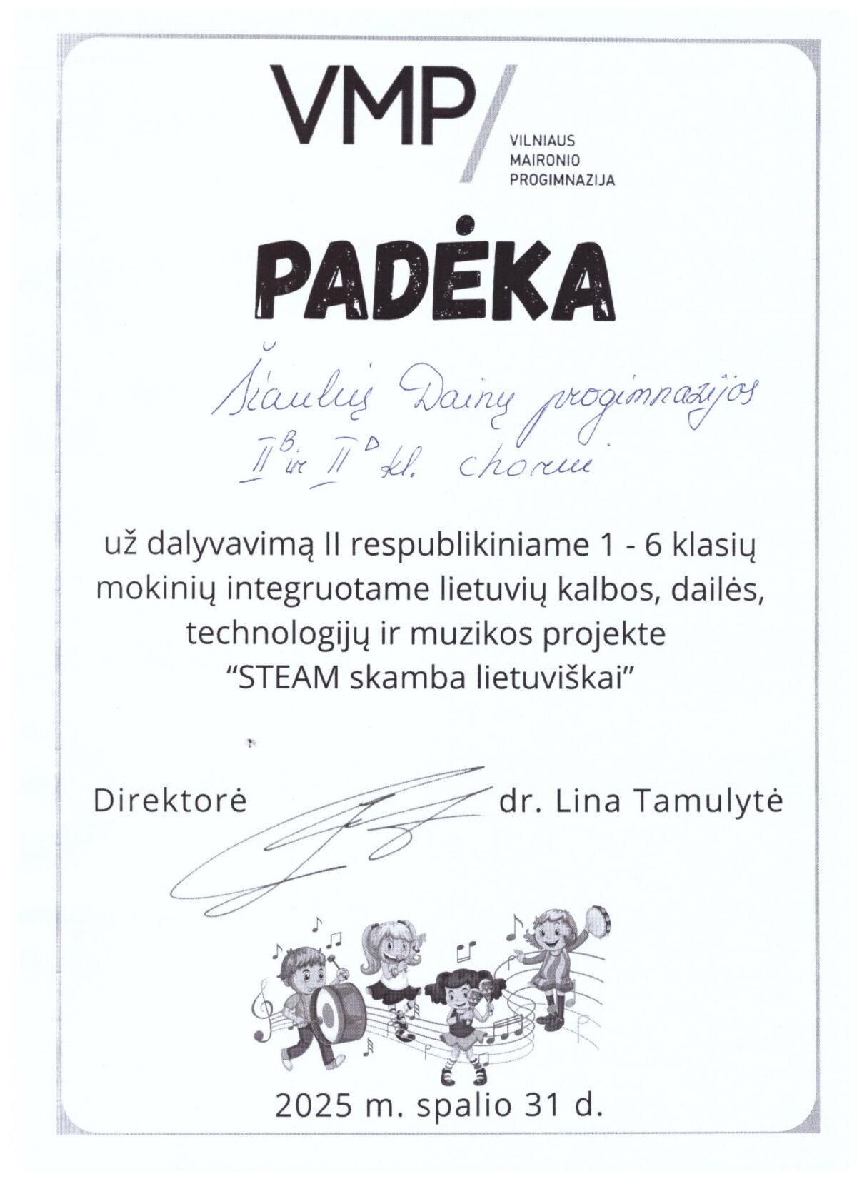 2025 m. spalio mėn. Šiaulių Dainų progimnazijos 2b ir 2d klasių mokiniai dalyvavo respublikiniame 1-6 klasių mokinių virtualiame integruotame lietuvių kalbos, dailės, technologijų ir muzikos projekte ,,STEAM skamba lietuviškai“, kurį organizavo Vilniaus Maironio progimnazija. Muzikos pamokose mokiniai išsirinko, išmoko dainuoti ir įrašė lietuvių liaudies dainą ,,Lakštingalėle, graži paukštele“. Lietuvių kalbos pamokose – išnagrinėjo dainos tekstą, išsiaiškino jo prasmę, neįprastų žodžių reikšmes, technologijų ir dailės pamokose – iš antrinių žaliavų gamino įvairiausius ritminius muzikos instrumentus, kuriais akompanavo dainai. Mokinius paruošė: muzikos mokytoja Ingrida Jonavičienė, pradinio ugdymo mokytoja Rasa Solovjovienė ir pradinio ugdymo mokytoja Loreta Augulienė. Visus vienijo graži tarpusavio bendrystė.