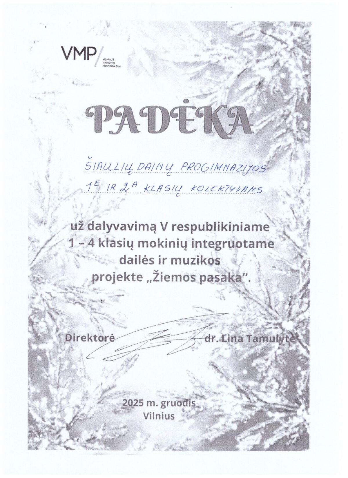 2025 m. lapkričio ir gruodžio mėn. 1e ir 2a klasių mokiniai dalyvavo respublikiniame 1 – 4 klasių mokinių integruotame dailės ir muzikos projekte ,,Žiemos pasaka“. Projektą organizavo Vilniaus Maironio progimnazija. Projekto tikslas – puoselėti domėjimąsi daile, muzika, plėtoti mokinių kūrybinės raiškos gebėjimus dailės ir muzikos menų formomis. Mokiniai atliko ir įrašė nuostabias Ingos Šeduikienės dainas: ,,Sniegenos laiškas“ ir ,,Kalėdos miške“, išnagrinėję dainų tekstus, naudodami įvairias piešimo technikas, nupiešė labai gražius žiemos piešinius. Šiuos kūrinius sudėjo į video kūrimo programą ir sumontavo video klipą projektui ,,Žiemos pasaka“. Mokinius konsultavo pradinio ugdymo mokytojos Lina Mateikienė, Inga Petrukonienė ir muzikos mokytoja Ingrida Jonavičienė. Didžiuojamės savo mokiniais ir jų darbais.