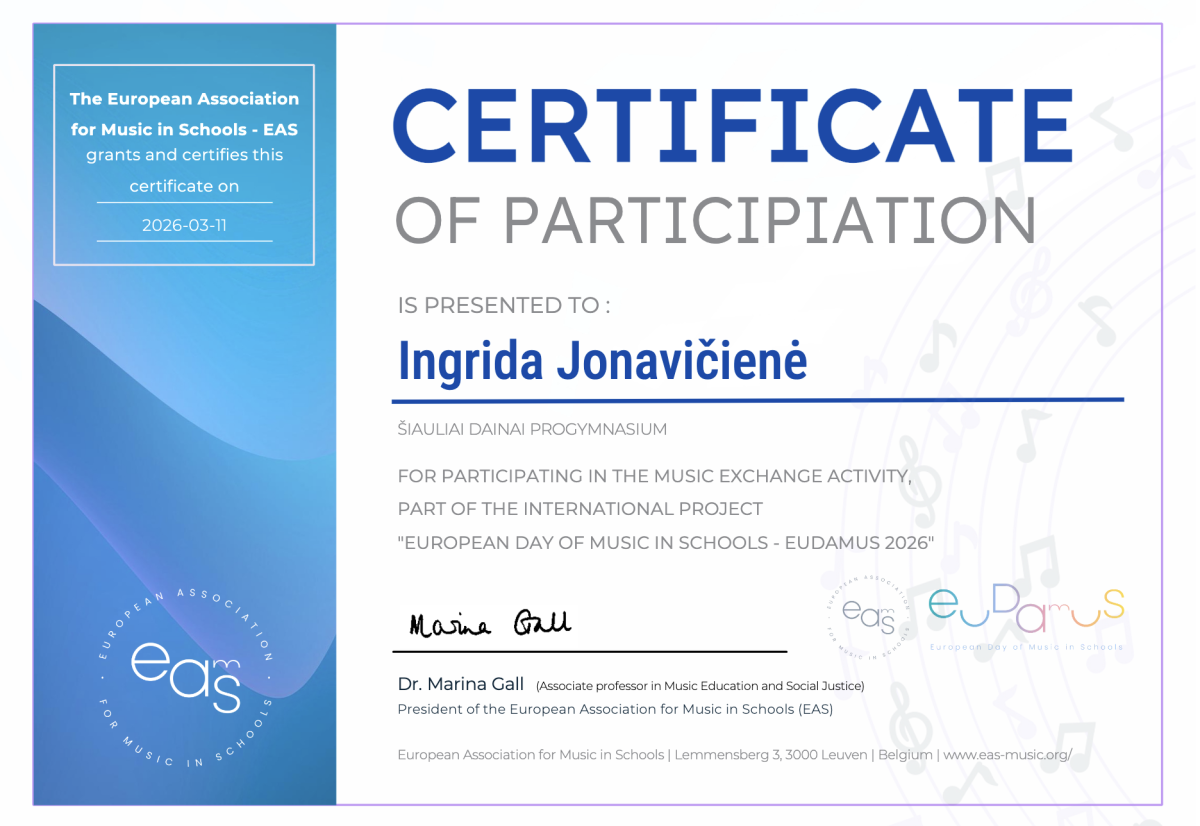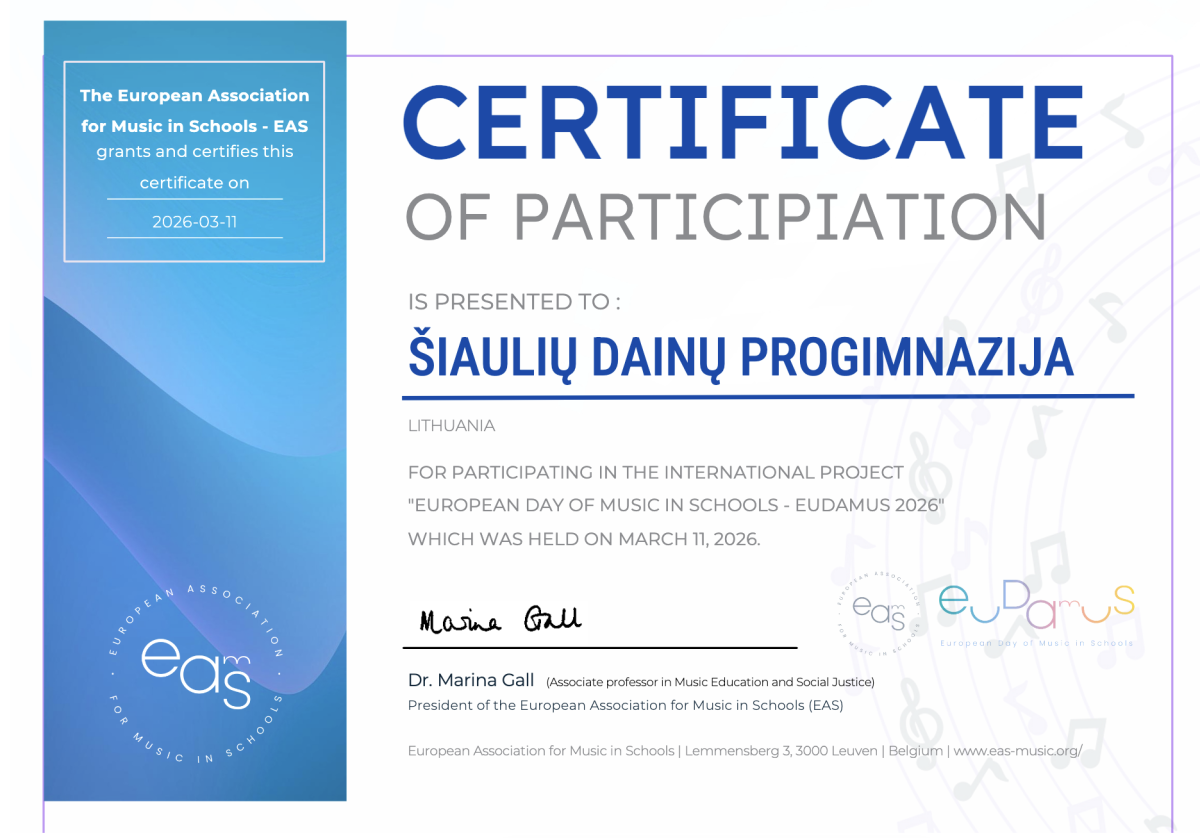 2026 m. lapkričio – kovo mėn. Šiaulių Dainų progimnazijos 5 – 8 kl. mokiniai dalyvavo tarptautiniame Europos muzikos dienos ,,EuDaMus 2026“ projekte. Renginyje dalyvavo daugelio Europos šalių mokyklų mokiniai ir jų mokytojai. Projektui buvo pateiktas Lietuvos muzikinį ugdymą reprezentuojantis 5-8 kl. mokinių sukurtas filmukas ,,Muzika mano mokykloje“.