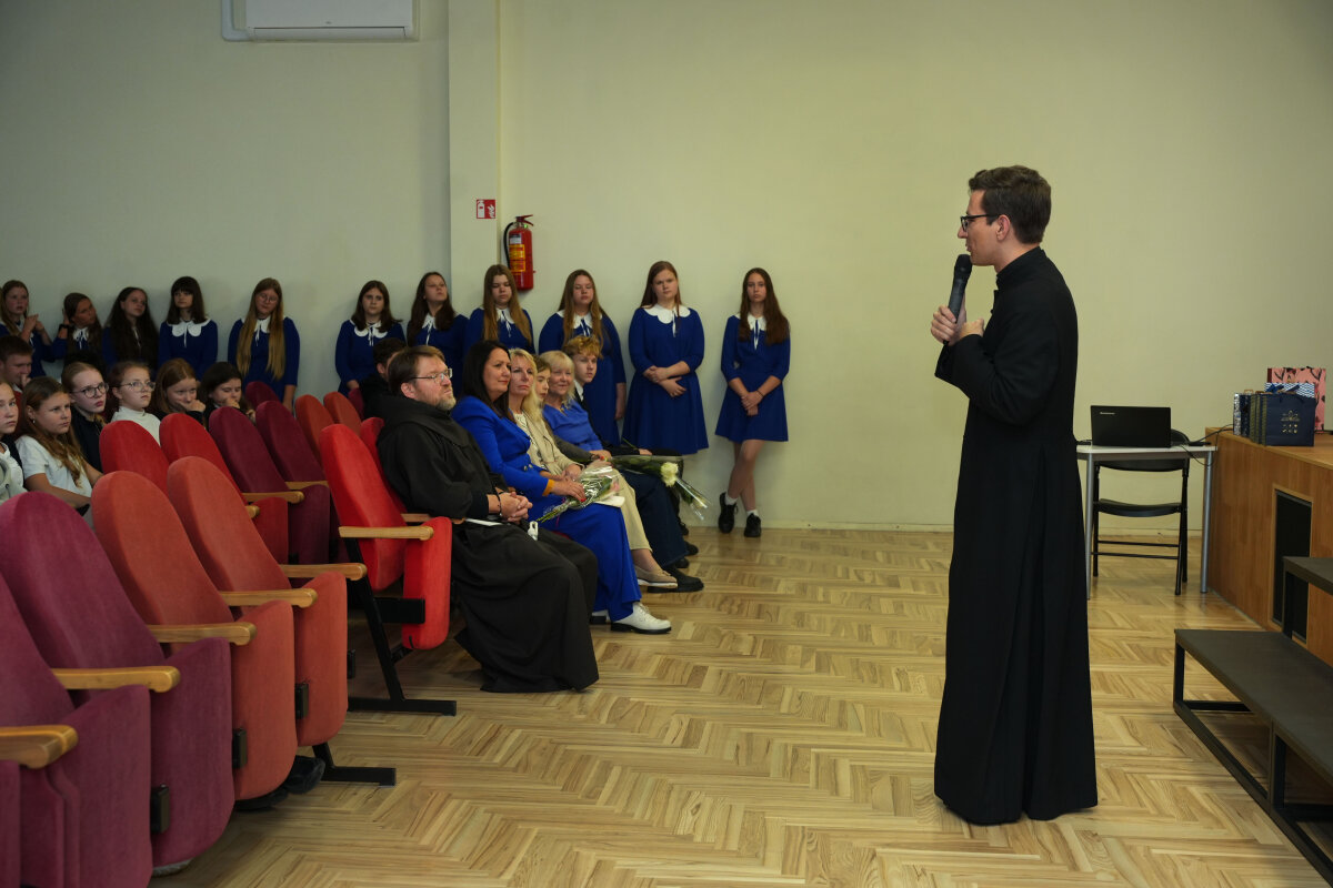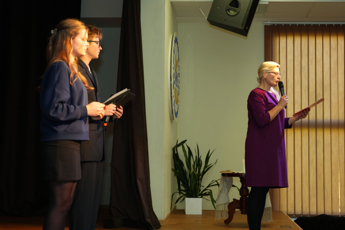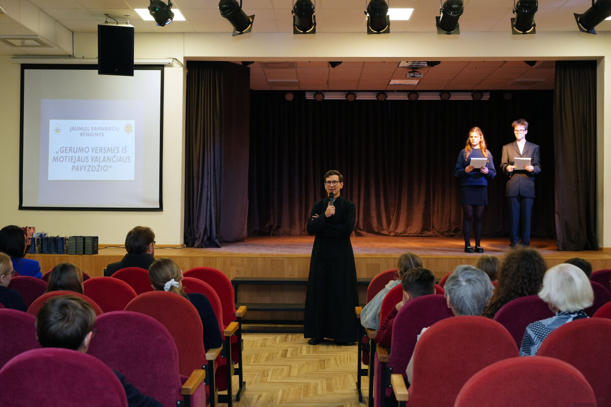Renginys, kuris skirtas Motiejaus Valančiaus 225 metinėms paminėti, vyko bendradarbiaujant su Šiaulių „Romuvos“ progimnazijos ir Šiaulių Juliaus Janonio gimnazijos jaunaisiais samariečiais. Renginį gražiu šokiu „Lelijų tyvuliavimas“ pradėjo šiuolaikinių šokio studija „Kosmėja“ (vadovės Diana Maciuvienė ir Livija Andruškevičiūtė). Progimnazijos direktorė Asta Vaičiūnienė pasidžiaugė mokinių geranoriškumu, atjauta, pagalba ir meile savanoriaujant, pasveikino mokyklų jaunuosius samariečius, visiems linkėjo iniciatyvumo skleidžiant gėrį, sekant Motiejaus Valančiaus pavyzdžiu. Šiaulių Švč. Mergelės Marijos Nekaltojo Prasidėjimo bažnyčios kunigas Gediminas Kasperavičius jaunimui pasakojo apie Motiejaus Valančiaus gyvenimo kelią, atskleidė jo asmenybės bruožus, padrąsino jaunimą būti tomis švieselėmis, kurios neužgestų, neštų šilumą ir meilę. Pranešimą „Vyskupo Motiejaus Valančio – gerumo kelias“ skaitė 8d kl. mokinė Dominyka Erlickaitė (mokytoja Inga Valeikienė). Dainų progimnazijos 7-8 kl. jaunieji samariečiai Liudas Pikūnas, Pranas Klovas, Kristupas Karazija, Adrijus Zimka, Arnas Marcinkus, Ąžuolas Ponelis, Adrijus Racevičius, Norvydas Valiulis, Orestas Novikovas suvaidino gailestingojo samariečio istoriją. ,,Romuvos“ progimnazijos jaunųjų samariečių vadovė Saulė Raubickaitė pristatė jaunųjų samariečių priesaiką. Renginyje skambėjo dainavimo studijos „Vivo“, 7d kl. mokinės Ugnės Kazlauskaitės daina ,,Vidury žemyno“ (vadovė Ingrida Jonavičienė). Brolis Paulius Vaineikis, pranciškonų vienuolis iš Kryžių kalno vienuolyno, pasidžiaugė jaukia, gražia Dainų progimnazija, gabiais mokiniais, kurie šoko, vaidino, dainavo. Jis savo prasmingais žodžiais bei giesmėmis liudijo meilę ir tikėjimą. Lietuvos samariečių bendrijos Šiaulių skyriaus pirmininkė, Šiaulių Juliaus Janonio gimnazijos samariečių vadovė Danutė Kratukienė sveikino jaunuosius samariečius, įteikė kiekvienam „Samariečio ženklelį“, jaunimui linkėjo tobulinti savo lyderystės įgūdžius, daryti gerus darbus su didele meile. Renginį vedė 8a kl. mokiniai Faustina Bloškytė ir Benas Vasiliauskas. Už gražias šventės akimirkų nuotraukas dėkojame Linai Pčelincevaitei.