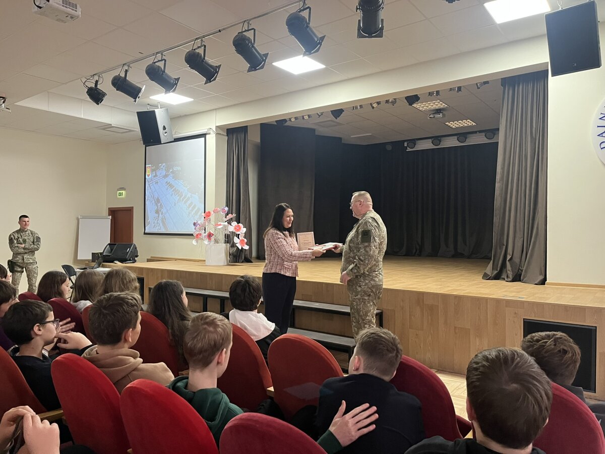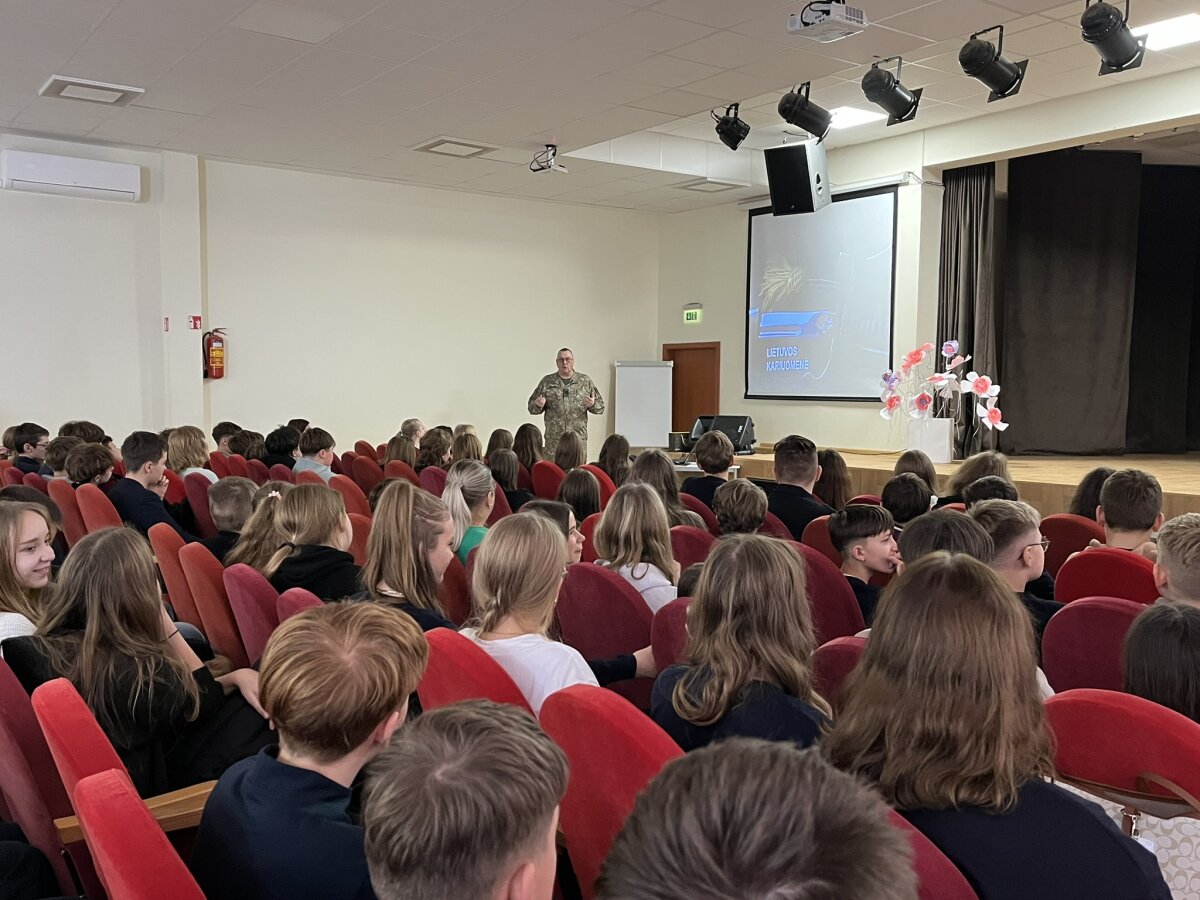 Mūsų mokykla šią savaitę minėjo Lietuvos kariuomenės dieną, o šiai progai ypatingą prasmę suteikė svečiai iš Karo prievolės ir komplektavimo tarnybos Šiaulių skyriaus. Jie mokiniams skaitė paskaitą apie kariuomenės sudėtį, misiją, struktūrą ir kasdienę tarnybą, pristatė, kaip ši institucija veikia šiandien ir kokie iššūkiai jai keliami tiek Lietuvoje, tiek užsienyje.
