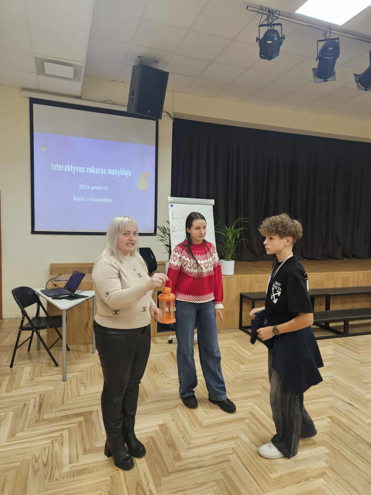 2025 m. gruodžio 9 d. Šiaulių Dainų progimnazijoje vyko Interaktyvus vakaras, subūręs 5–8 klasių mokinius į kūrybišką, aktyvią ir bendradarbiavimu grįstą vakarą. Tai renginys, skatinantis saviraišką ir tarpusavio ryšius, kuriame kiekvienas dalyvis gali atrasti savo vaidmenį ir pagal savo gebėjimus prisidėti prie bendros atmosferos kūrimo. Visą vakarą mokinių veiduose švytėjo smalsumas, laukimas ir džiaugsmas.