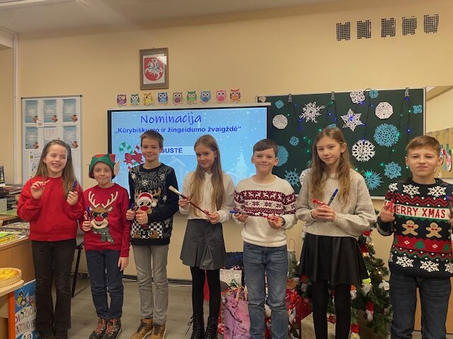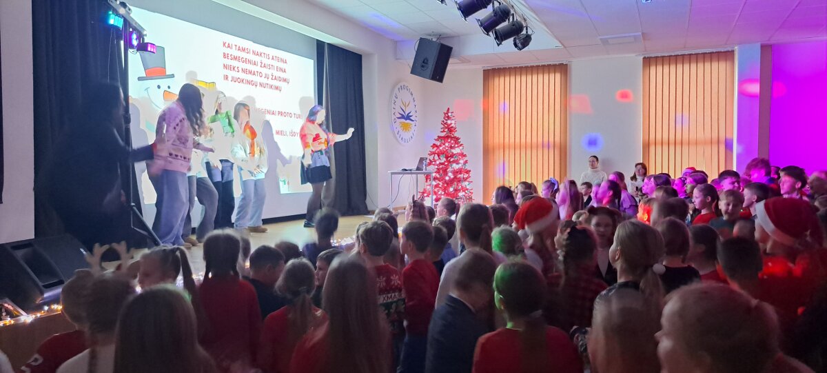 Mokiniai pasitikrino žinias šventiniame Kahoot žaidime. Mažieji PUG ugdytiniai kartu su pradinių klasių mokiniais linksminosi muzikos mokytojos Simonos Spranaitytės organizuotoje kalėdinėje diskotekoje.