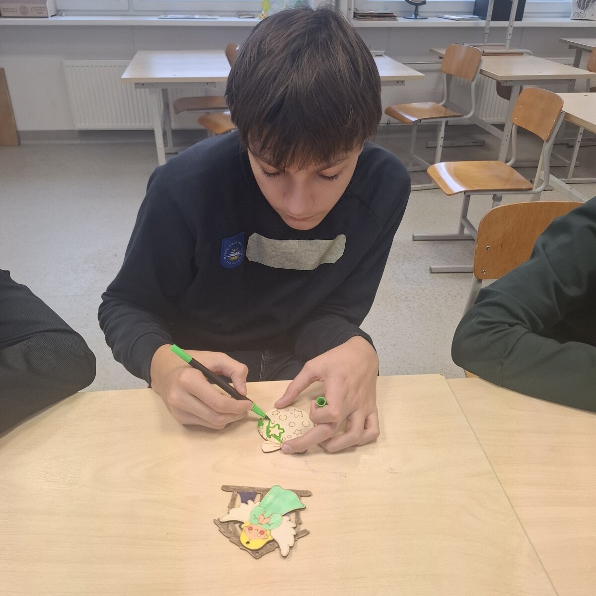 Pirmos grupės mokiniai susipažino su pagrindiniais Kalėdų simboliais ir spalvino medinius žaisliukus, suteikdami jiems savitų spalvų ir raštų.