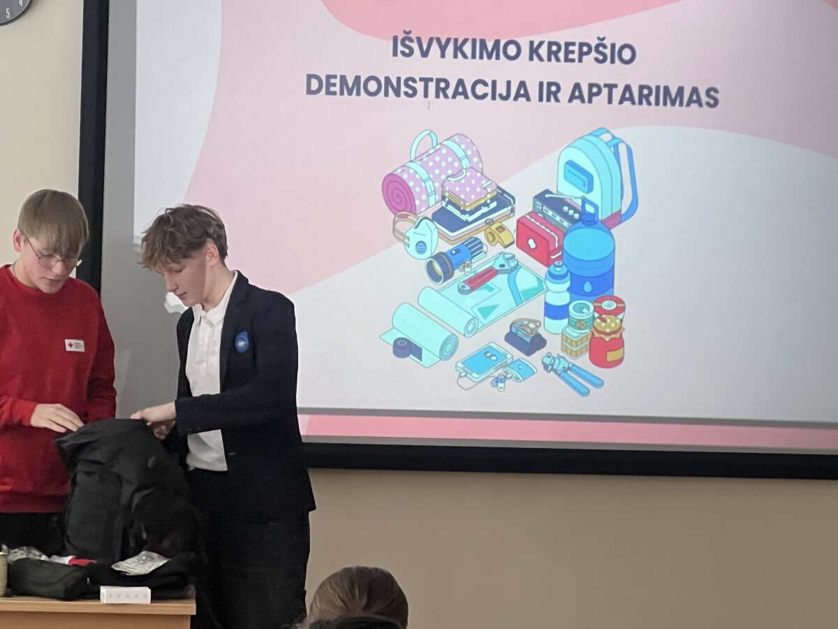 Praktinėje dalyje mokiniai turėjo galimybę apžiūrėti tikrą išvykimo krepšį, išbandyti jo turinį, aptarti, kam skirtas kiekvienas daiktas ir kodėl jis svarbus. Tokia patirtis leido ne tik išgirsti teoriją, bet ir realiai suprasti pasirengimo svarbą.