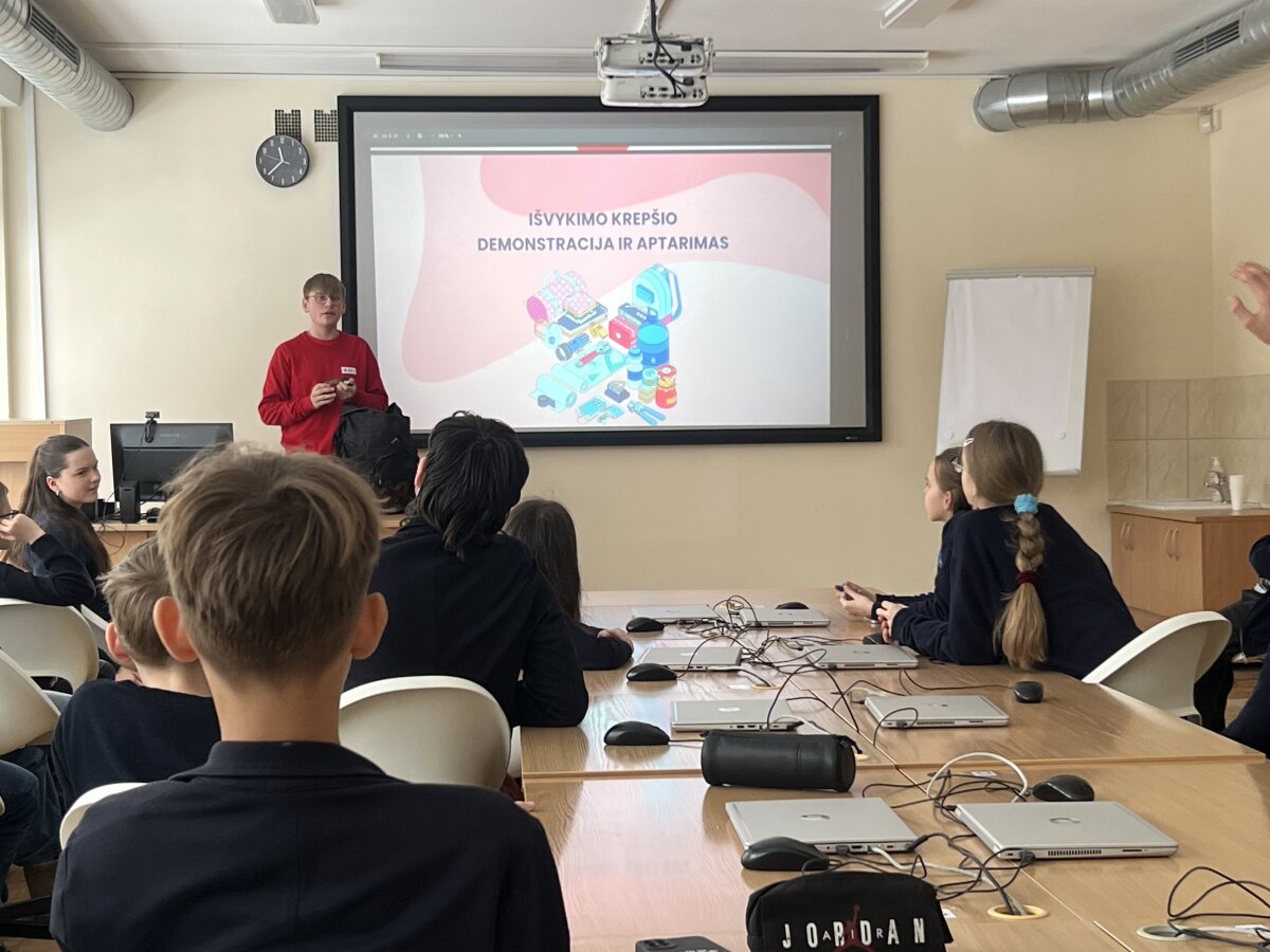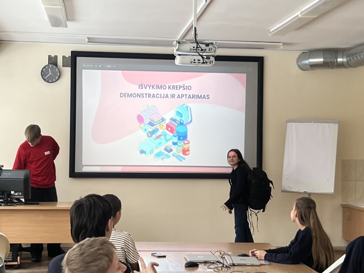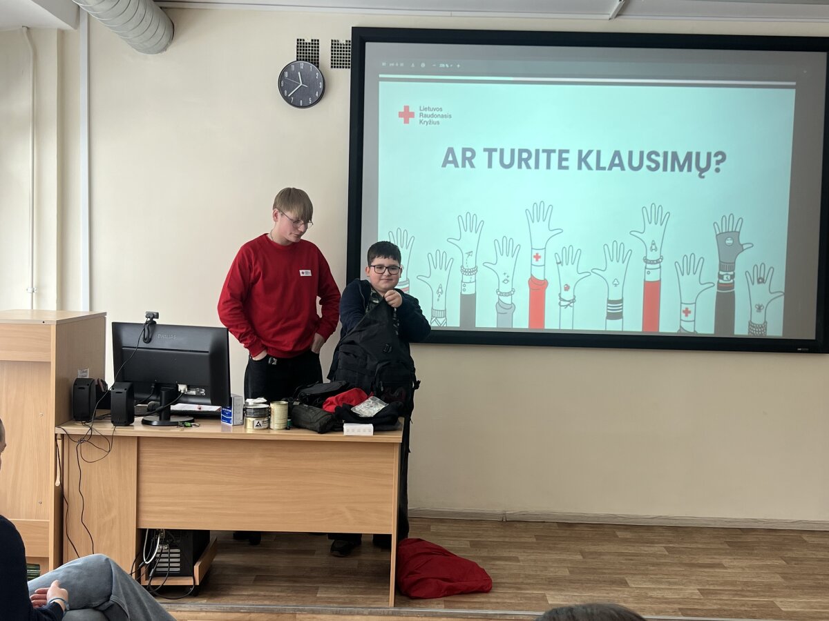 2026 m. vasario 24 d. 6D klasėje vyko integruota klasės valandėlės ir gyvenimo įgūdžių pamoka, kurios metu mokiniai gilino žinias apie pasirengimą ekstremalioms situacijoms. Pamokoje svečiavosi Raudonojo Kryžiaus savanoris Lukas iš Šiaulių „Romuvos“ progimnazijos.