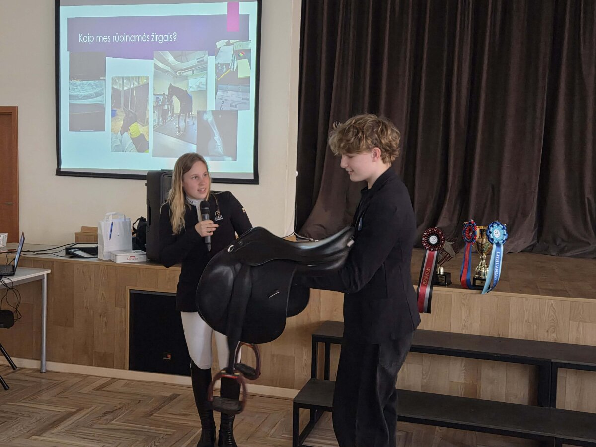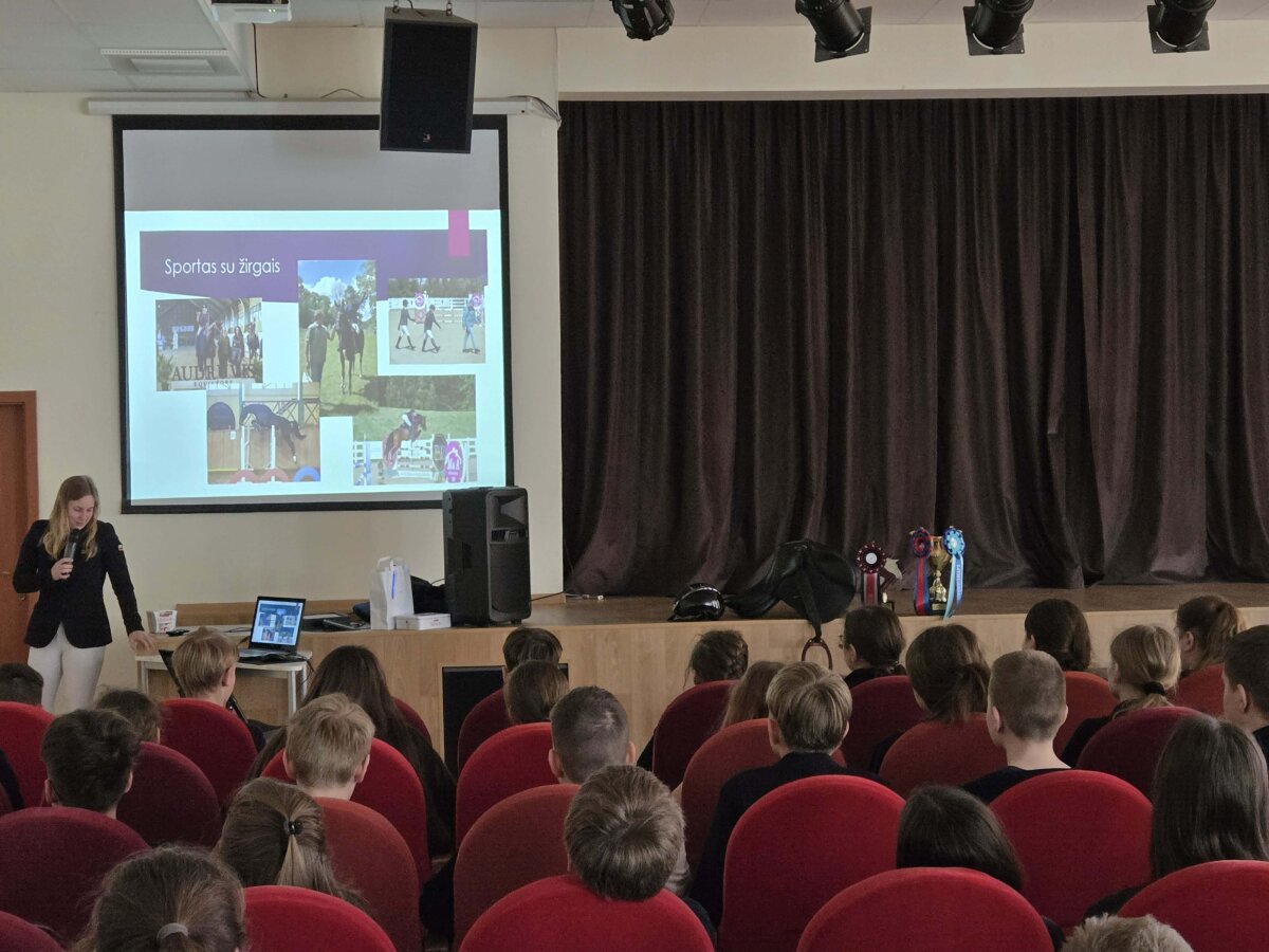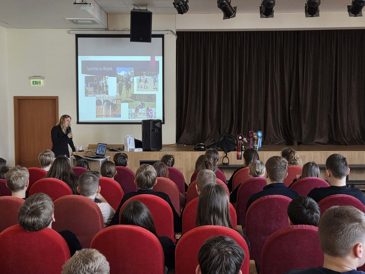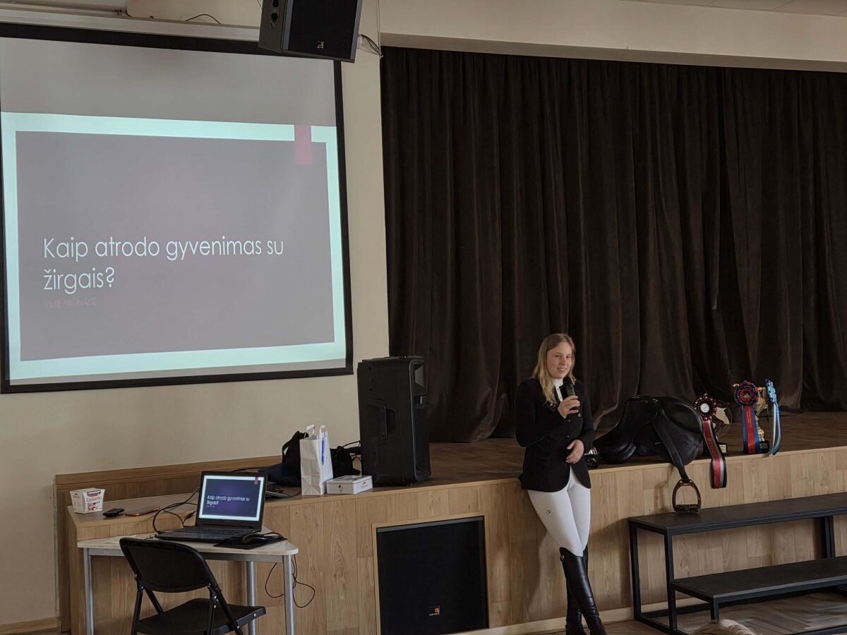 Viltė dalijosi savo asmenine patirtimi mokykloje, pasakojo apie dalyvavimą įvairiose veiklose, savanorystę bei asmeninio tobulėjimo svarbą. Ji taip pat išsamiau papasakojo apie savo veiklą žirgininkystėje – kaip susidomėjo šia sritimi, kiek pastangų ir atsakomybės reikalauja darbas su žirgais bei kokių savybių reikia norint siekti rezultatų. Mokiniai aktyviai domėjosi žirgais ir uždavė daug klausimų apie jų priežiūrą. Viltė paaiškino, kuo žirgai yra šeriami, kaip svarbu užtikrinti tinkamą jų mitybą ir nuolatinę priežiūrą. Ji taip pat papasakojo apie žirgų treniruotes, kasdienę rutiną, bendravimą su gyvūnu bei pasitikėjimo kūrimą. Mokiniai sužinojo, kad žirgai yra jautrūs ir protingi gyvūnai, todėl labai svarbu su jais elgtis kantriai ir atsakingai. Buvo aptarti ir saugumo aspektai – kaip tinkamai elgtis šalia žirgų, kad būtų išvengta traumų.