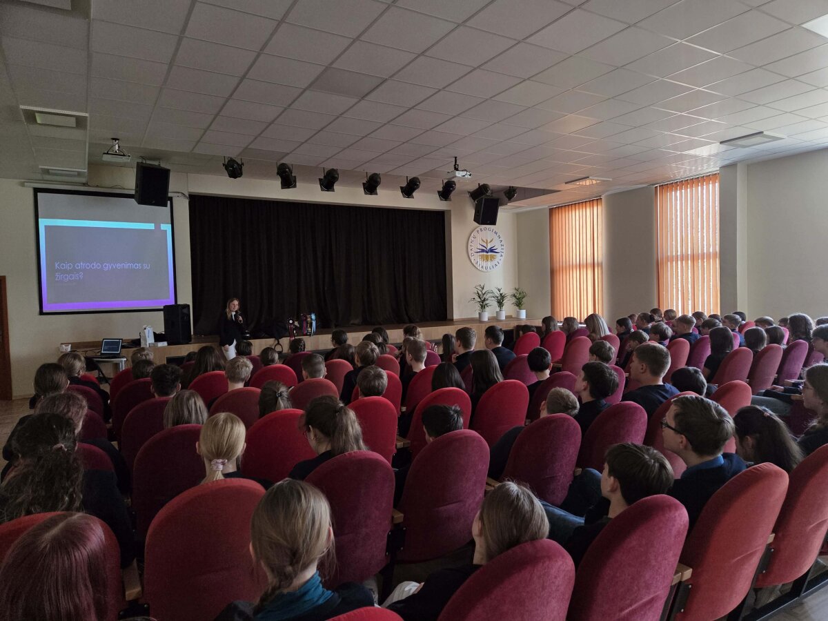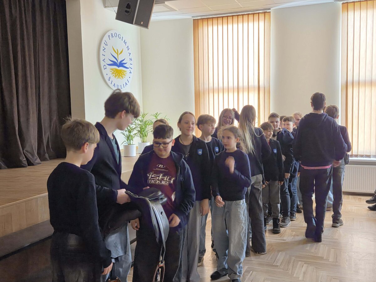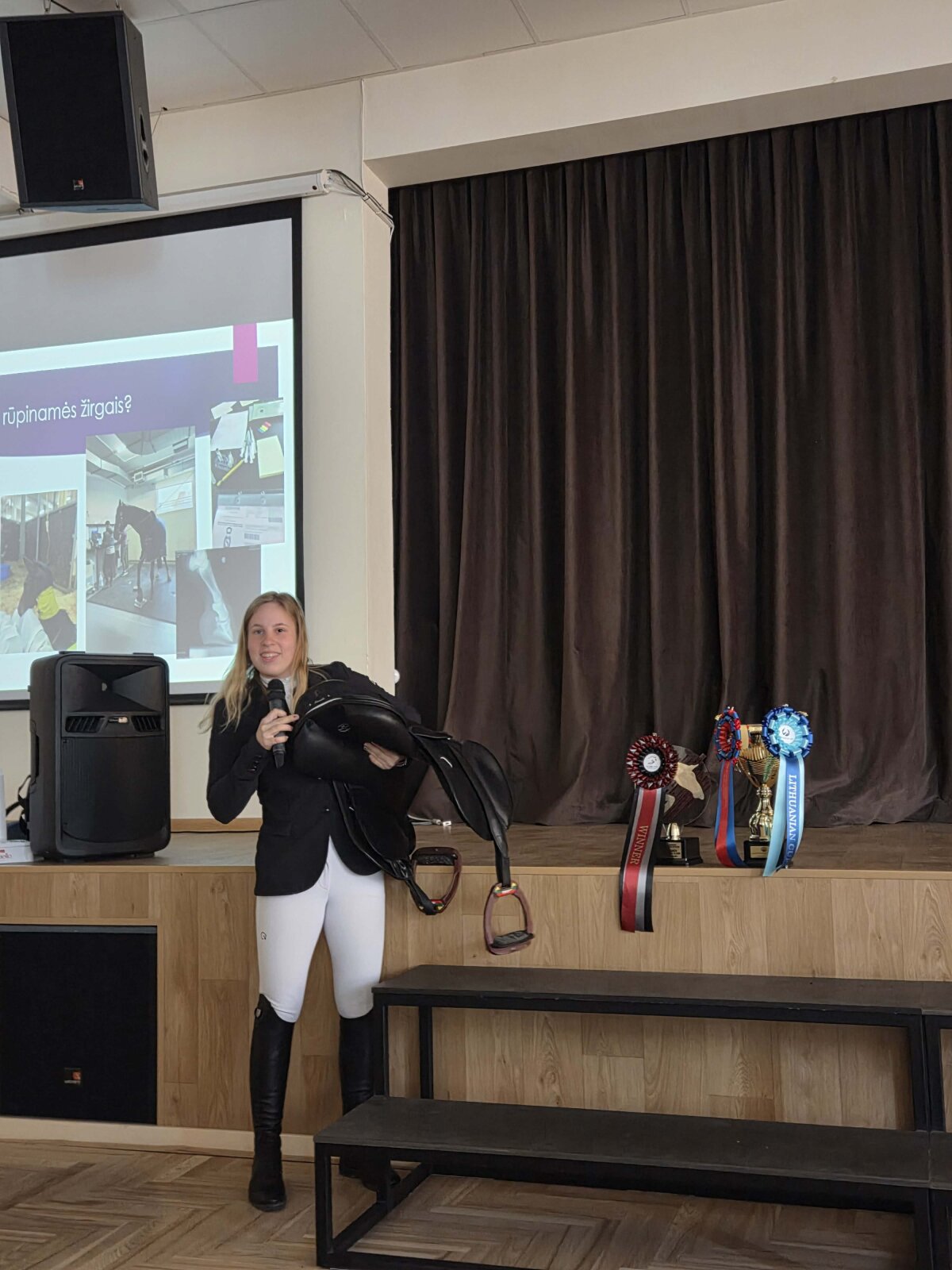 Viltė dalijosi savo asmenine patirtimi mokykloje, pasakojo apie dalyvavimą įvairiose veiklose, savanorystę bei asmeninio tobulėjimo svarbą. Ji taip pat išsamiau papasakojo apie savo veiklą žirgininkystėje – kaip susidomėjo šia sritimi, kiek pastangų ir atsakomybės reikalauja darbas su žirgais bei kokių savybių reikia norint siekti rezultatų. Mokiniai aktyviai domėjosi žirgais ir uždavė daug klausimų apie jų priežiūrą. Viltė paaiškino, kuo žirgai yra šeriami, kaip svarbu užtikrinti tinkamą jų mitybą ir nuolatinę priežiūrą. Ji taip pat papasakojo apie žirgų treniruotes, kasdienę rutiną, bendravimą su gyvūnu bei pasitikėjimo kūrimą. Mokiniai sužinojo, kad žirgai yra jautrūs ir protingi gyvūnai, todėl labai svarbu su jais elgtis kantriai ir atsakingai. Buvo aptarti ir saugumo aspektai – kaip tinkamai elgtis šalia žirgų, kad būtų išvengta traumų.