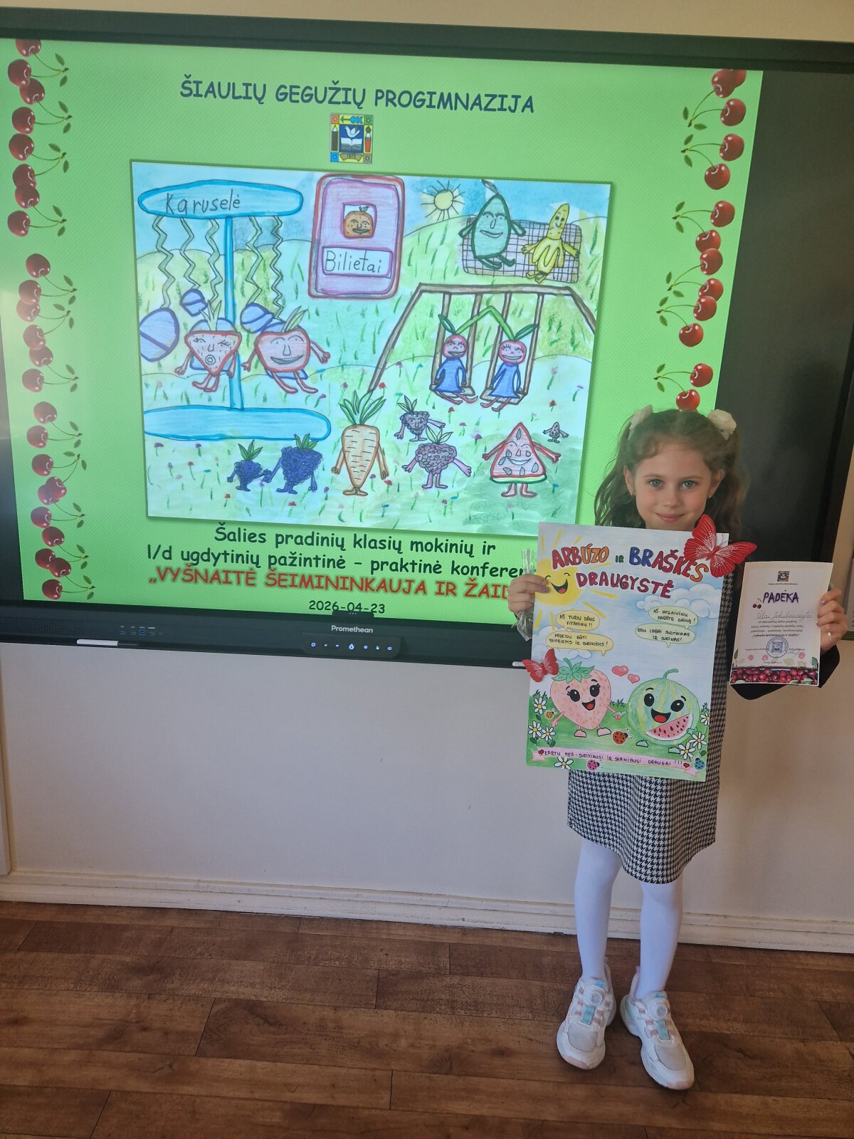 Balandžio 23 dieną, Šiaulių Gegužių progimnazijoje vyko šalies bendrojo ugdymo mokyklų 1–4 klasių mokinių ir priešmokyklinio ugdymo įstaigų ugdytinių konferencija „Vyšnaitė šeimininkauja ir žaidžia“. Konferencijos tikslas – formuoti sveikos gyvensenos įgūdžius, pabrėžiant gamtos galių ir žmogaus būties darną bei įtraukiant į šį procesą visuomenę. Joje dalyvavo Šiaulių Dainų progimnazijos PUG-2 grupės ugdytinės: Ūla Jokubauskytė ir Gabija Bučiutė. Ūla parengė stendinį pranešimą „Braškės ir arbūzo draugystė“ ir pristatė savo sukurtą pasakojimą apie dviejų vaisių draugystę, jų skirtumus ir bendrystę. Gabija skaitė pranešimą „Vaisių ir uogų paslaptys“ - supažindino klausytojus su vaisių ir uogų nauda žmogaus organizmui, jų svarba kasdienėje mityboje bei dalijosi žiniomis apie sveiką gyvenseną. Dalyvavimas konferencijoje praturtino ugdytinių patirtį, suteikė šiltų, įkvepiančių įspūdžių, stiprino pasitikėjimą savimi, viešojo kalbėjimo gebėjimus ir skatino domėjimąsi sveika gyvensena.