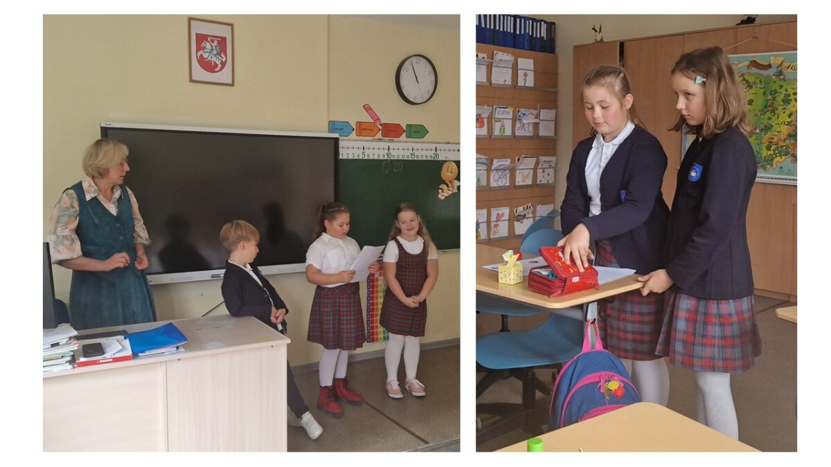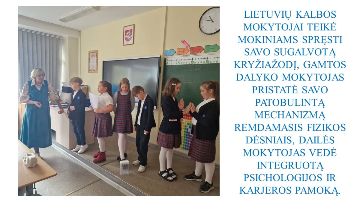 Spalio 3 d., artėjant Mokytojo dienai, karjeros specialistė Elmyra Damonskienė atvyko į 3b klasės (vadovė Irena Kazymirkienė) kabinetą pravesti UK klasės valandėlės ir buvo maloniai nustebinta – svetingi mokiniai, „pasirėdę mokytojo ir mokytojo padėjėjo uniformomis“, patys išradingai vedė Lietuvių kalbos, Matematikos, Gamtos ir Dailės pamokėles žinodami, jog geriausiai galima išmokti mokant kitus.