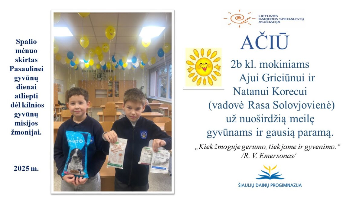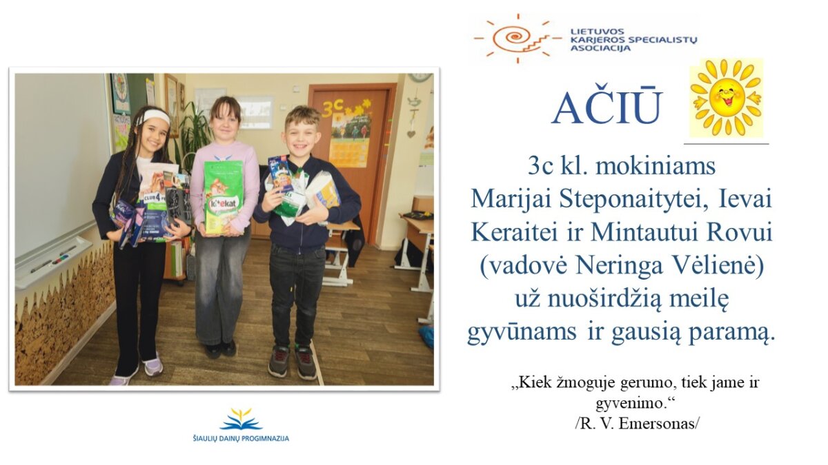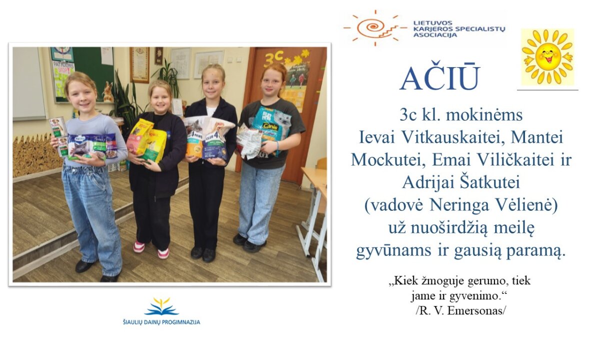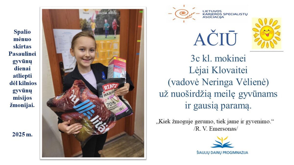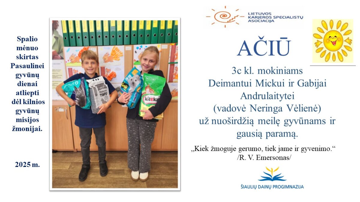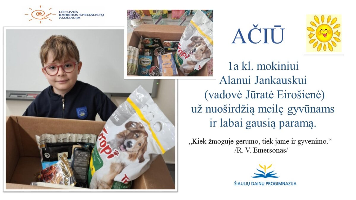 VšĮ „Binada“ steigėja Adelė Levanienė taria stipriausią AČIŪ kiekvienam Dainų progimnazijos bendruomenės nariui: mokiniui, tėveliui, mokytojui, klasės vadovui, administracijos nariui už dovanotą gerbūvį ir šilumą paliktiems gyvūnams. Te gerumas klesti ir vienija visą pasaulį.