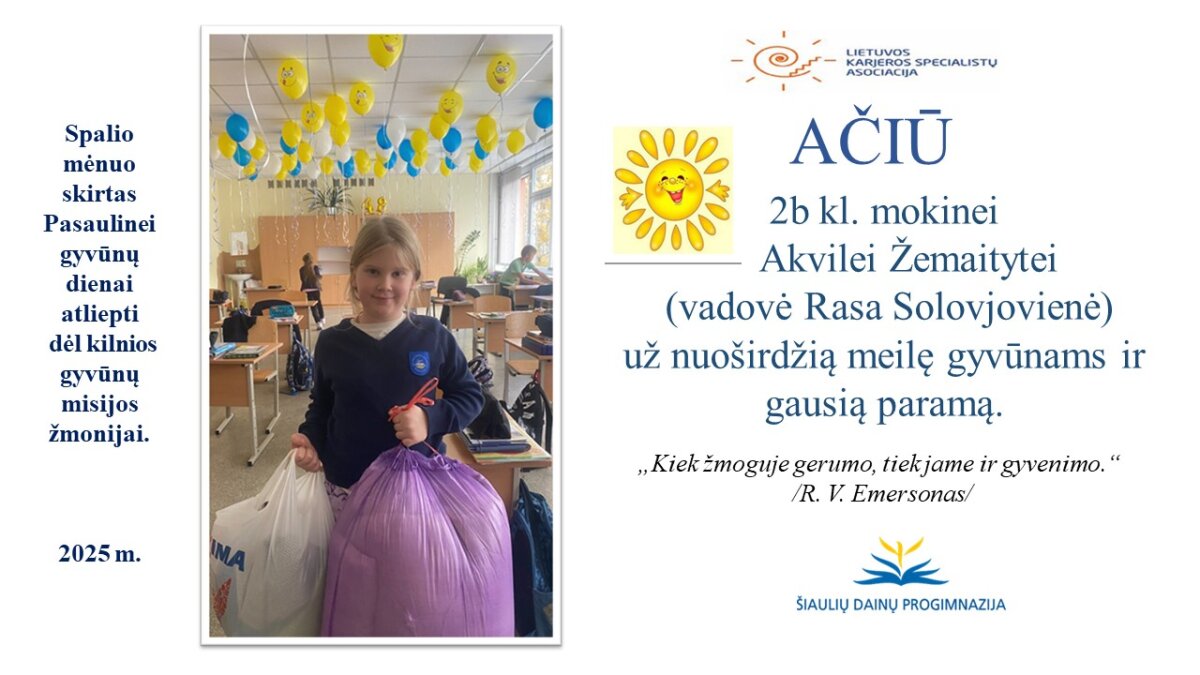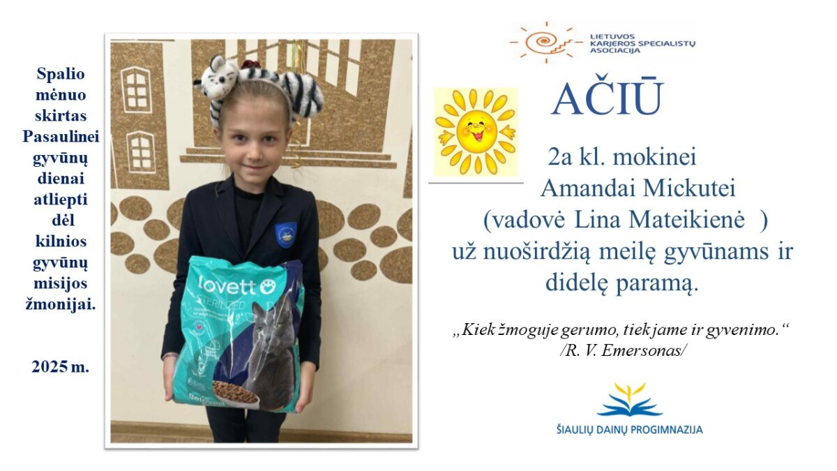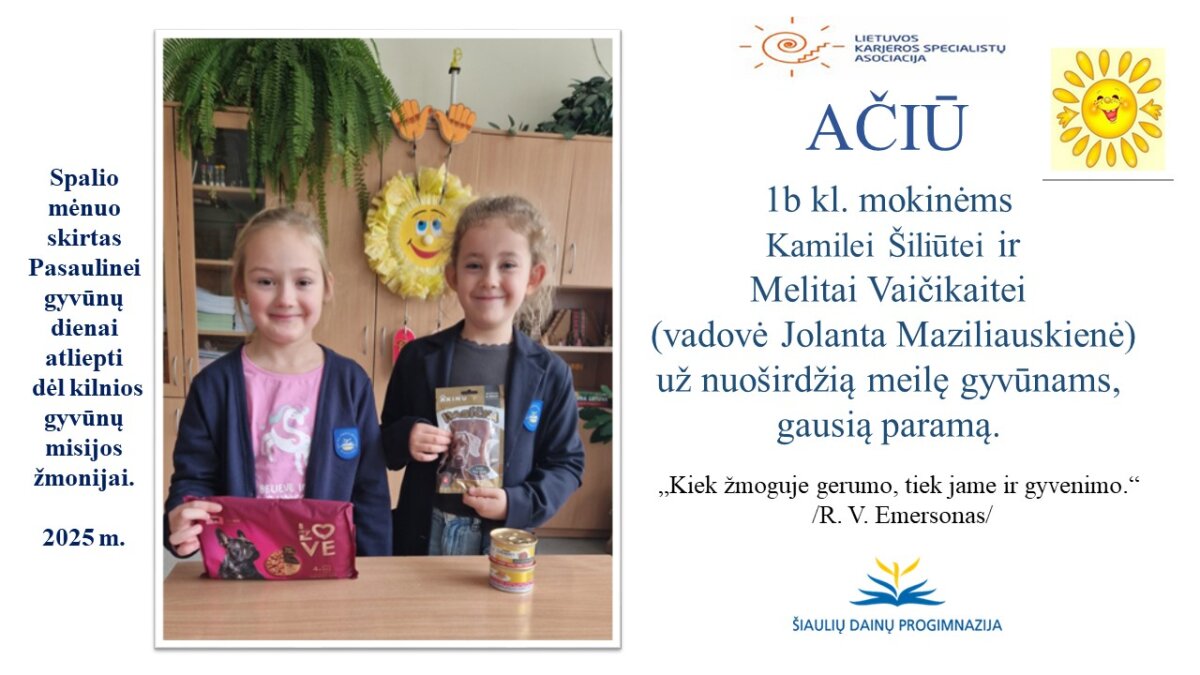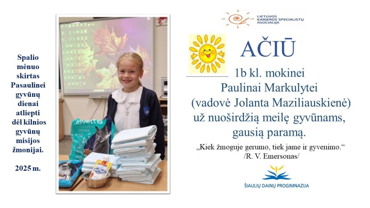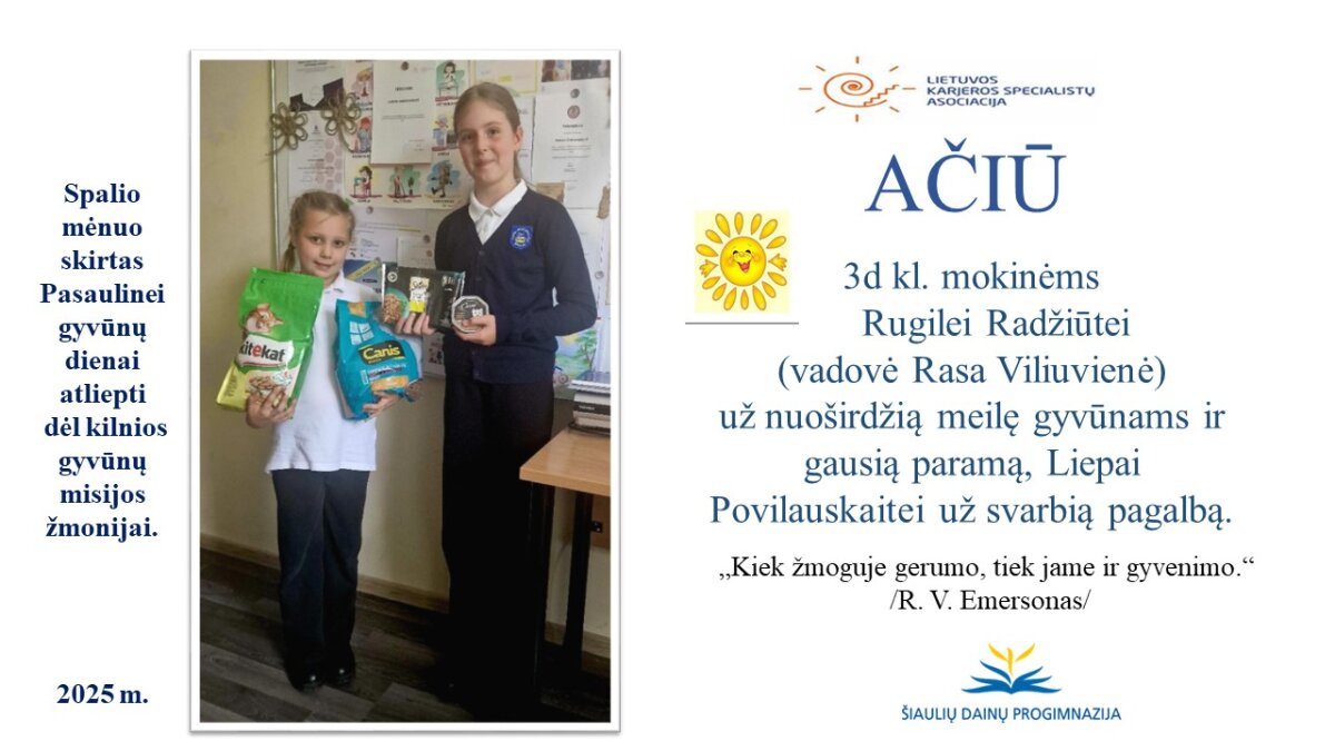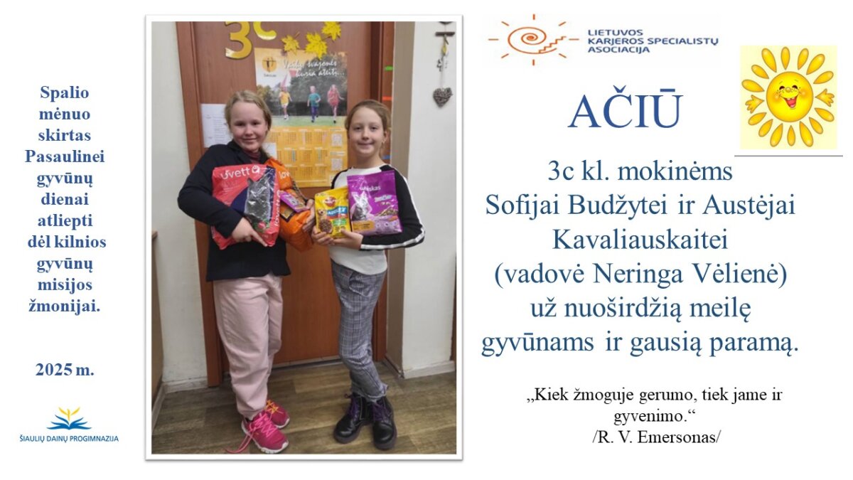 VšĮ „Binada“ steigėja Adelė Levanienė taria stipriausią AČIŪ kiekvienam Dainų progimnazijos bendruomenės nariui: mokiniui, tėveliui, mokytojui, klasės vadovui, administracijos nariui už dovanotą gerbūvį ir šilumą paliktiems gyvūnams. Te gerumas klesti ir vienija visą pasaulį.