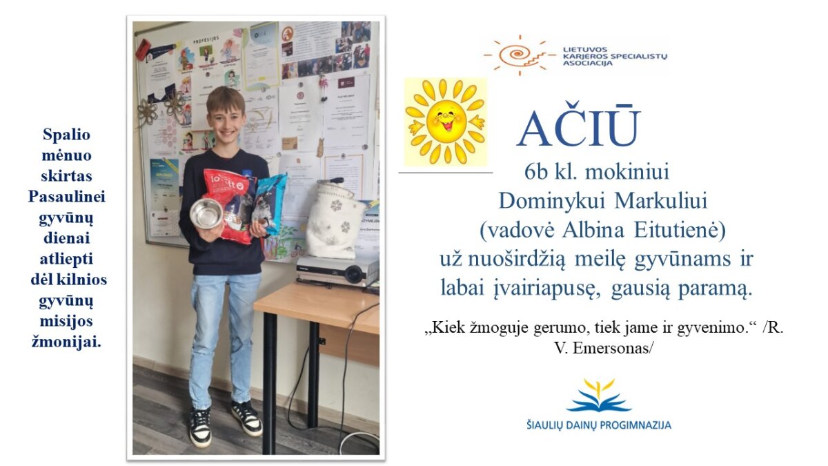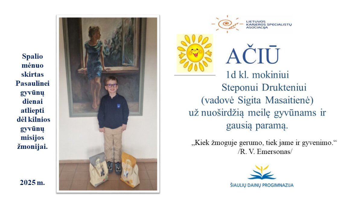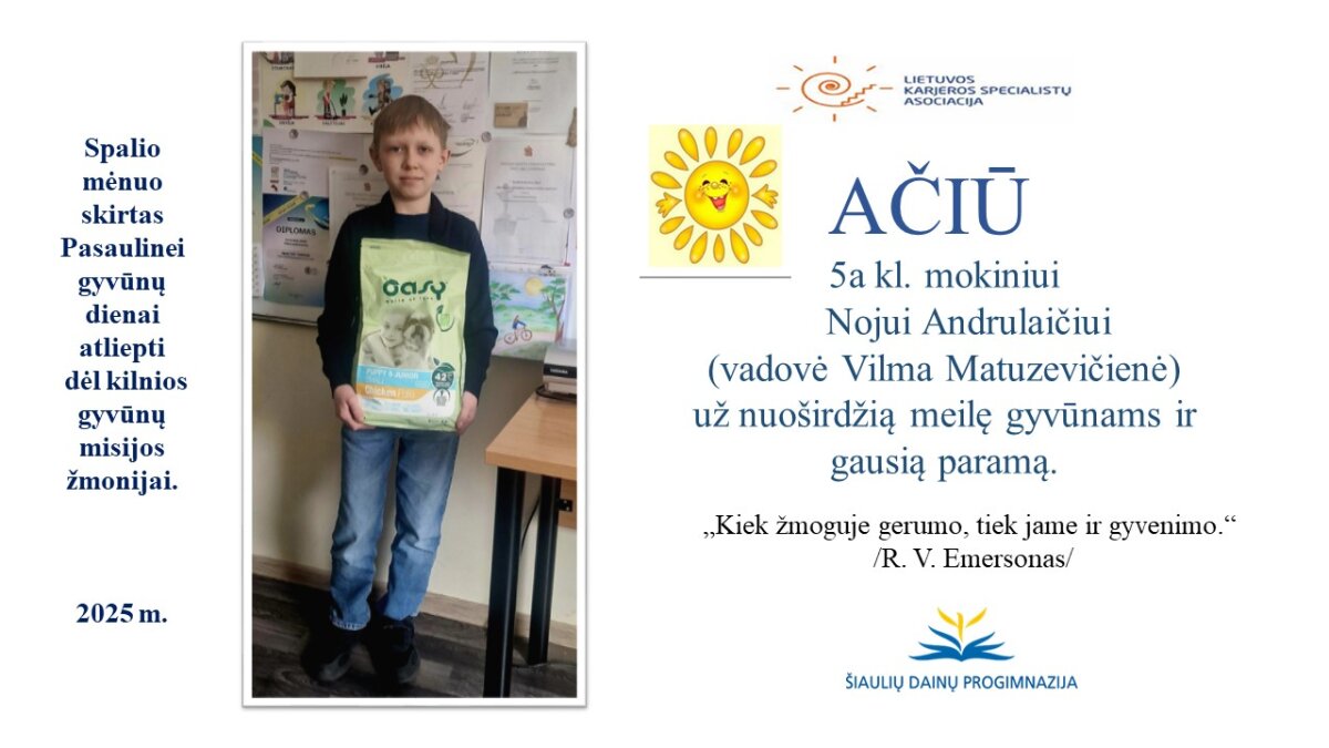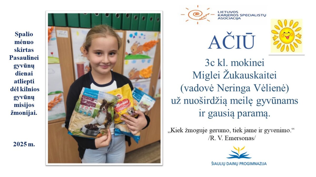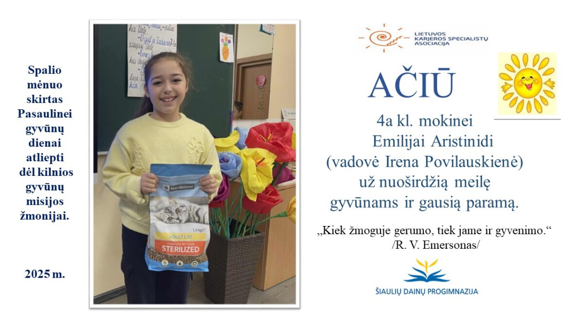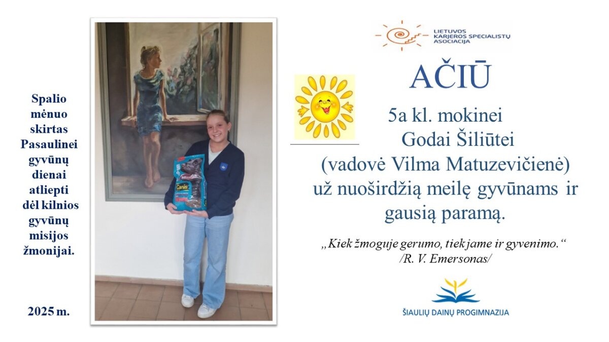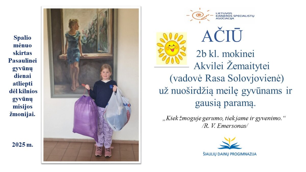 VšĮ „Binada“ steigėja Adelė Levanienė taria stipriausią AČIŪ kiekvienam Dainų progimnazijos bendruomenės nariui: mokiniui, tėveliui, mokytojui, klasės vadovui, administracijos nariui už dovanotą gerbūvį ir šilumą paliktiems gyvūnams. Te gerumas klesti ir vienija visą pasaulį.