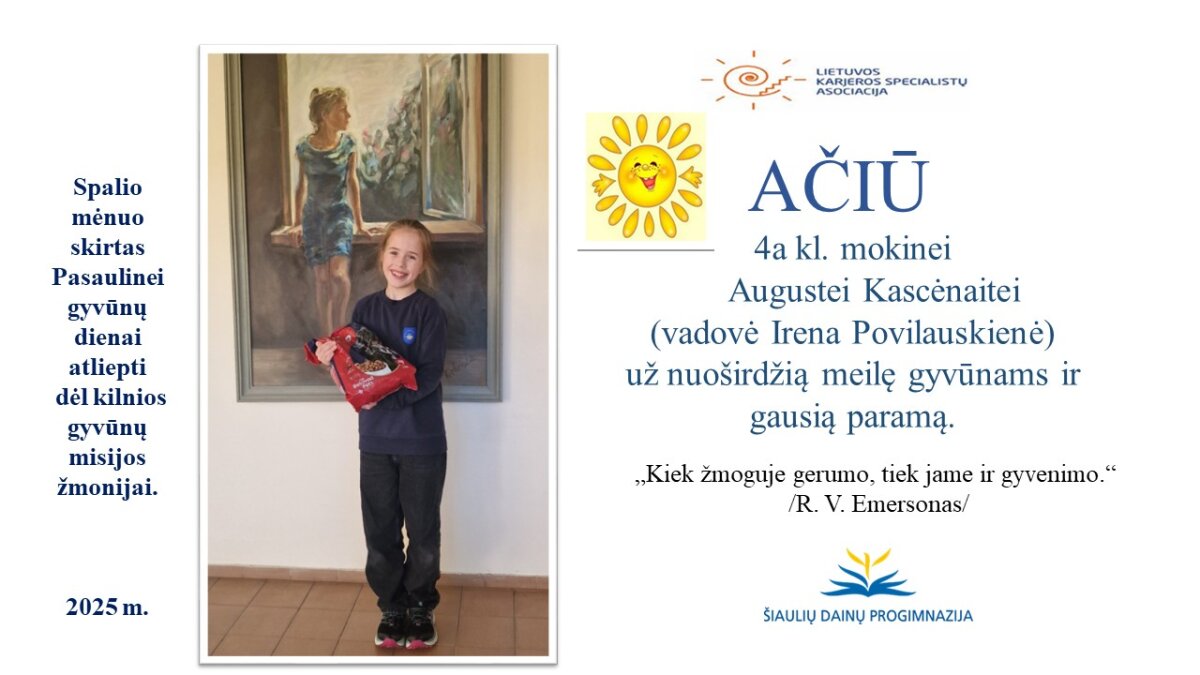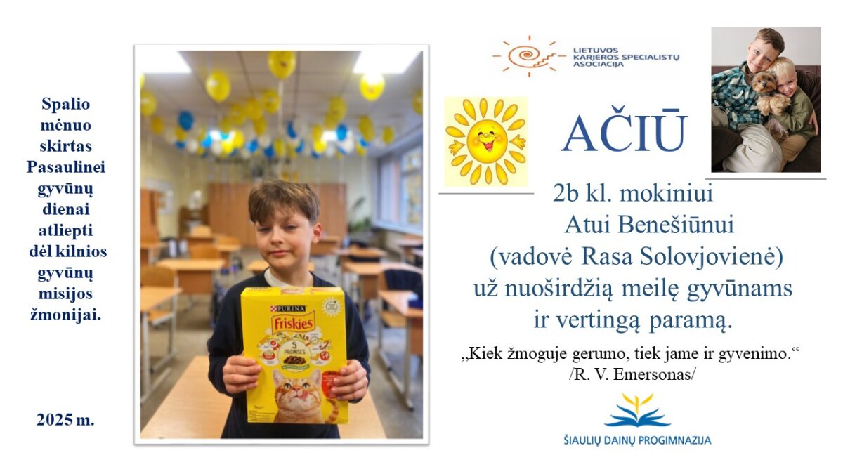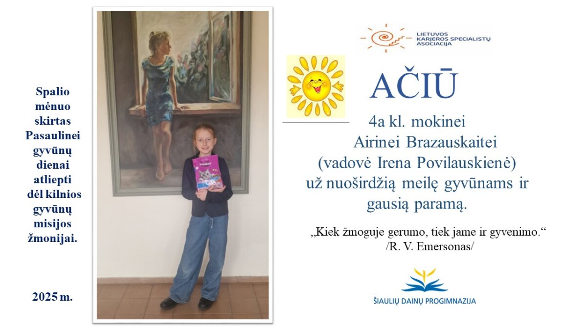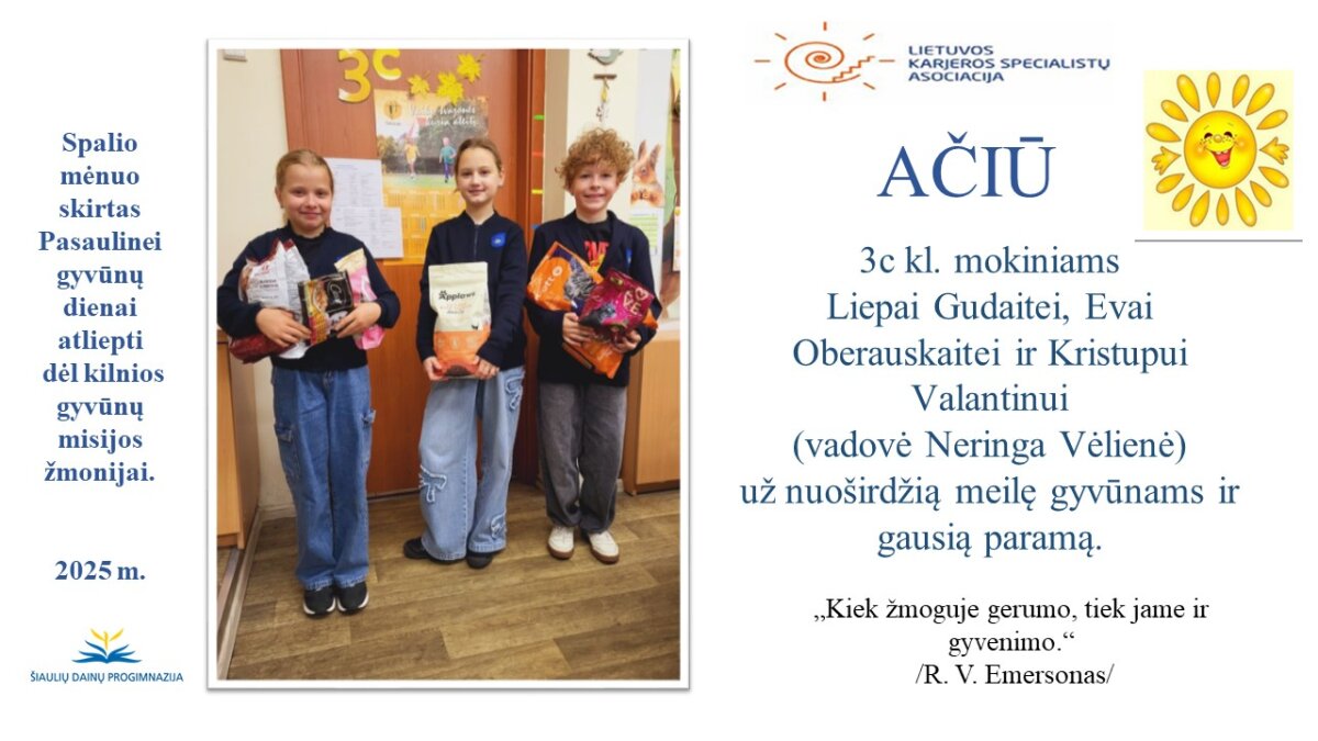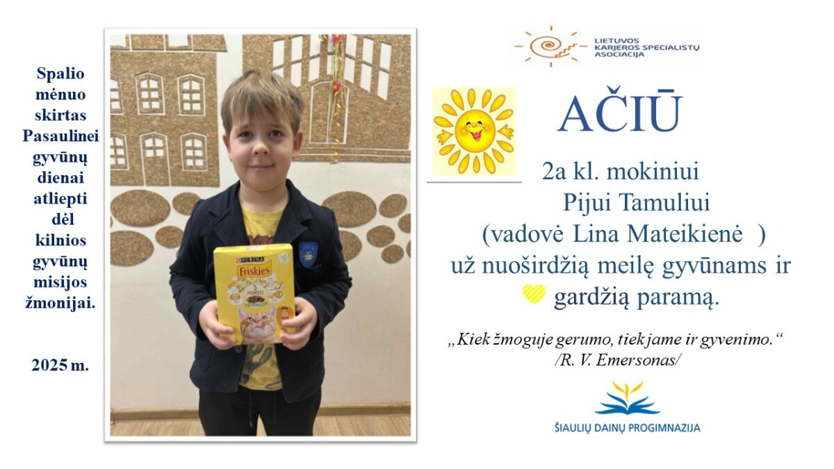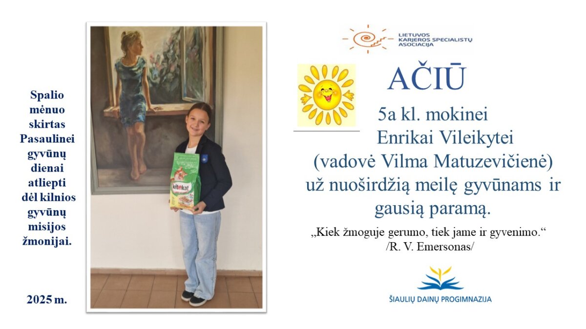 VšĮ „Binada“ steigėja Adelė Levanienė taria stipriausią AČIŪ kiekvienam Dainų progimnazijos bendruomenės nariui: mokiniui, tėveliui, mokytojui, klasės vadovui, administracijos nariui už dovanotą gerbūvį ir šilumą paliktiems gyvūnams. Te gerumas klesti ir vienija visą pasaulį.