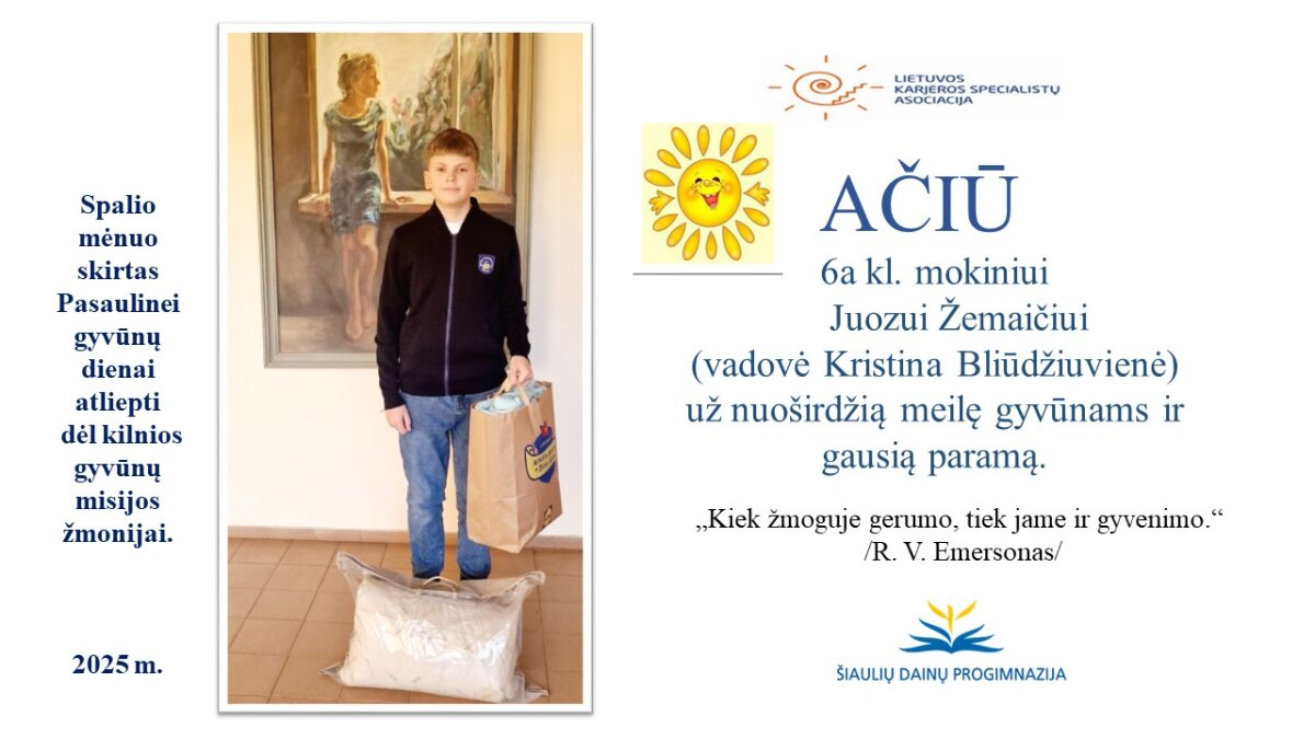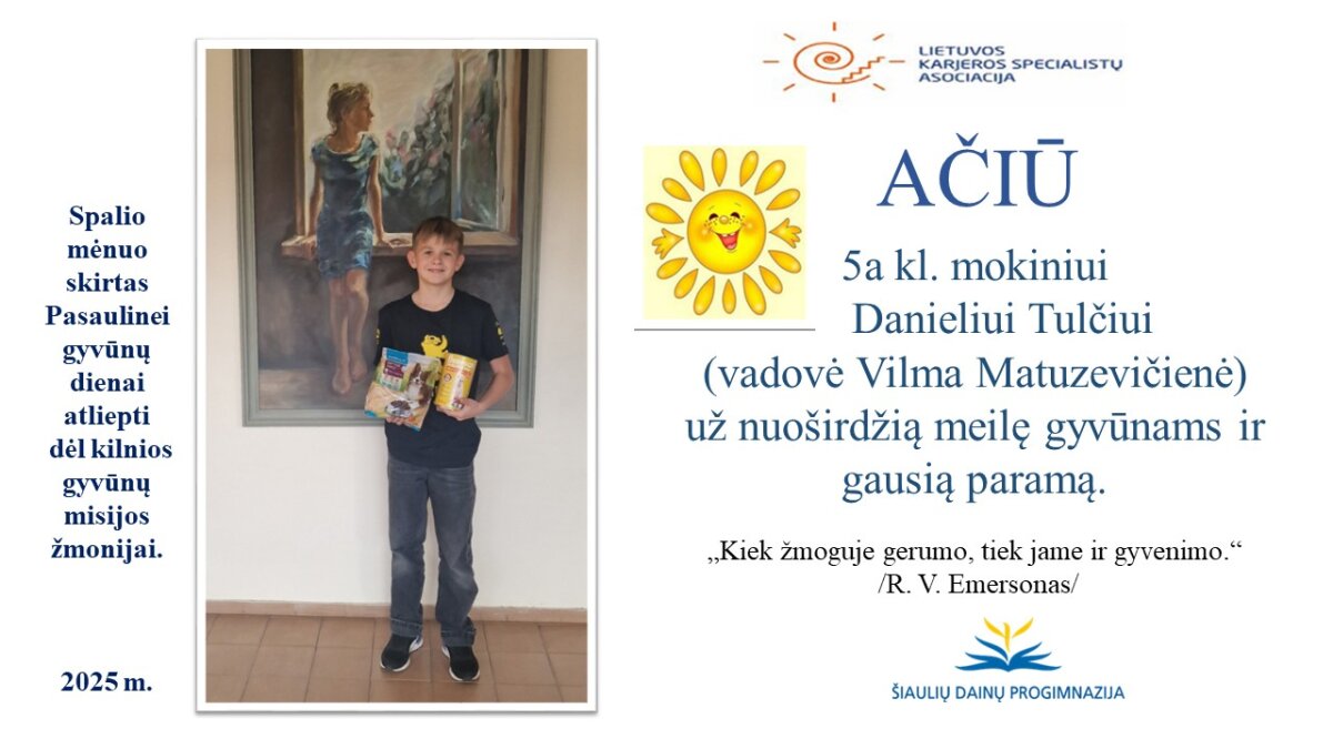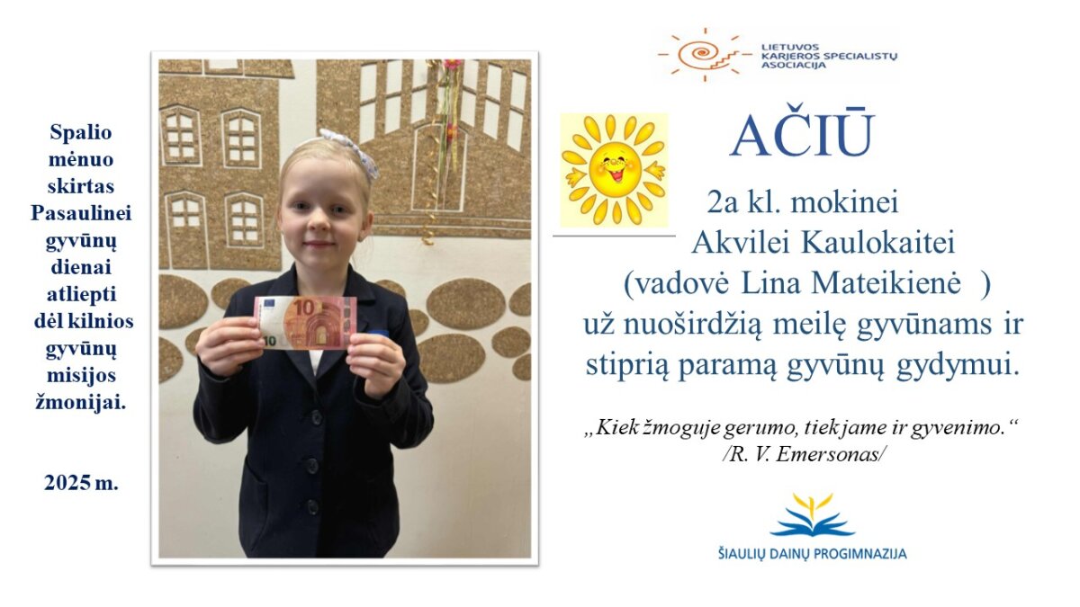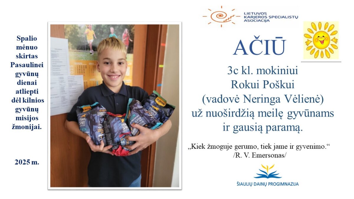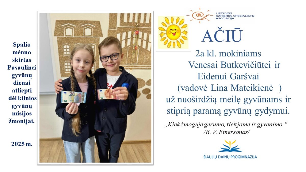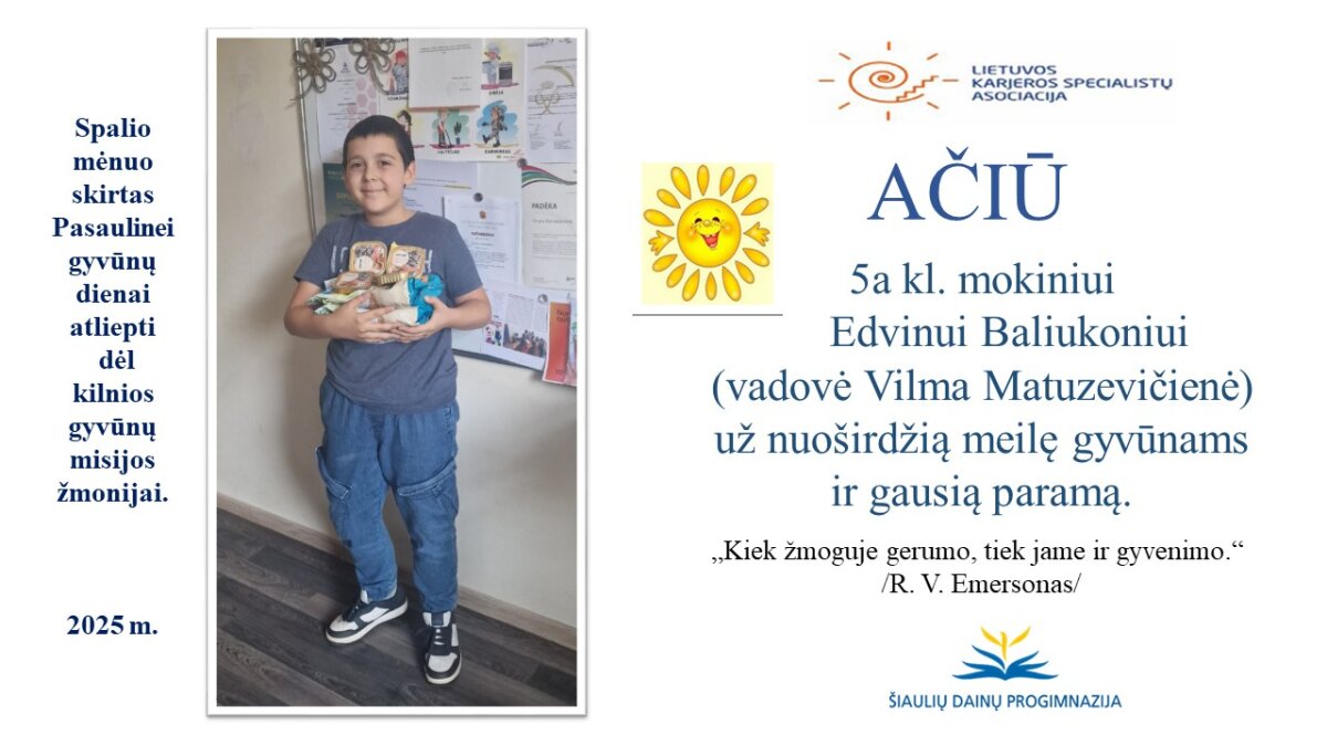 VšĮ „Binada“ steigėja Adelė Levanienė taria stipriausią AČIŪ kiekvienam Dainų progimnazijos bendruomenės nariui: mokiniui, tėveliui, mokytojui, klasės vadovui, administracijos nariui už dovanotą gerbūvį ir šilumą paliktiems gyvūnams. Te gerumas klesti ir vienija visą pasaulį.