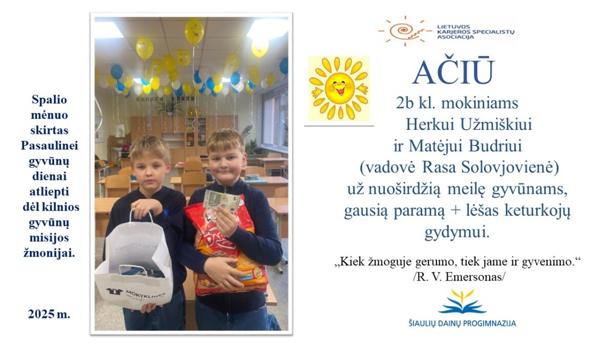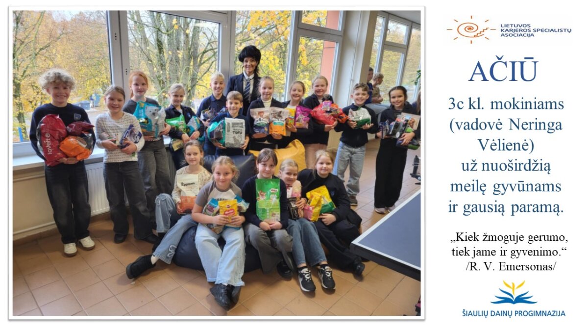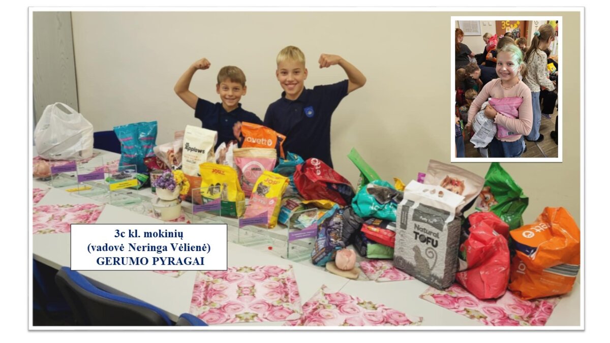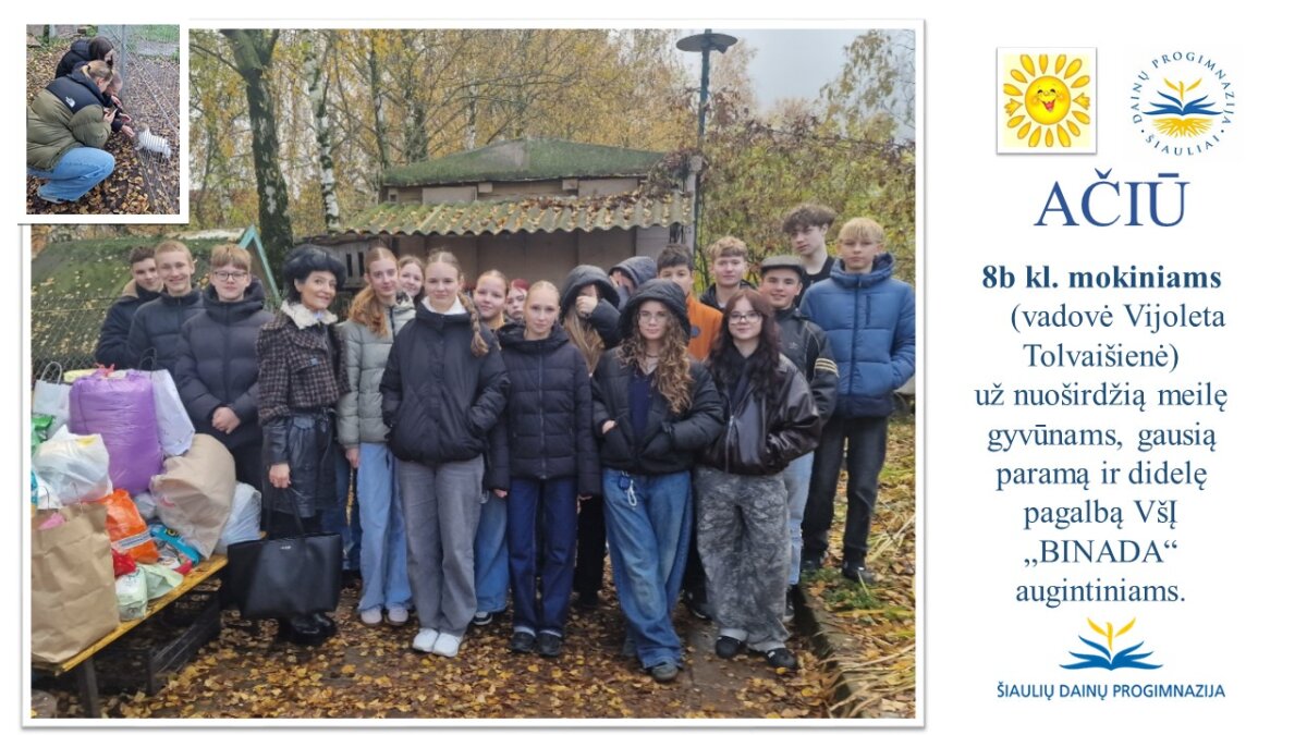Visą spalį didelės ir mažos dainiečių rankelės „kepė“ gerumo pyragus VšĮ „Binada“ globojamiems gyvūnams, kurie labai stokoja ne tik tyros meilės ir šilumos, bet ir gydymo. Mūsų vyriausieji 8b klasės (vadovė Vijoleta Tolvaišienė) mokiniai savo ir visos mokyklos bendruomenės labdarą specialiu automobiliu pristatė keturkojams.