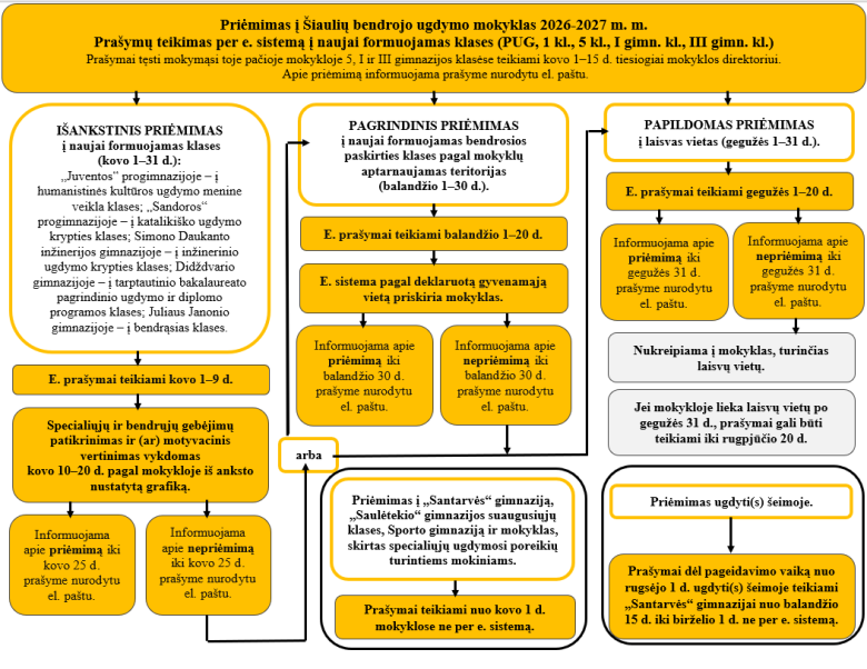 Prašymus e. sistemoje turi pateikti būsimųjų priešmokyklinukų, pirmokų, penktokų (pereinančių iš pradinių mokyklų į progimnaziją), atvykusių gyventi į Šiaulius mokinių tėvai. Apie vaiko priėmimą arba nepriėmimą į mokyklą tėvai bus informuojami atskiru pranešimu į jų nurodytą el. pašto adresą.
