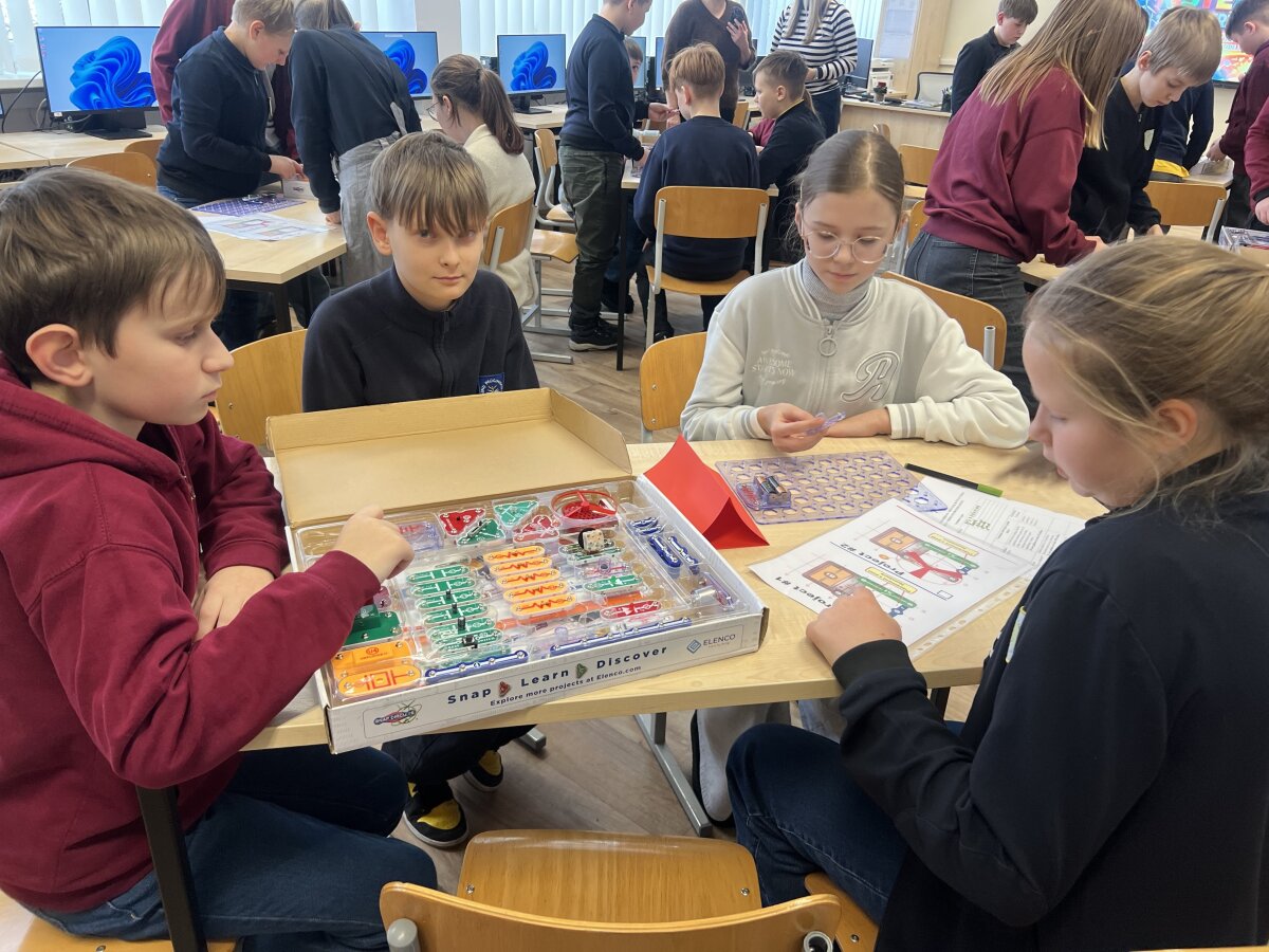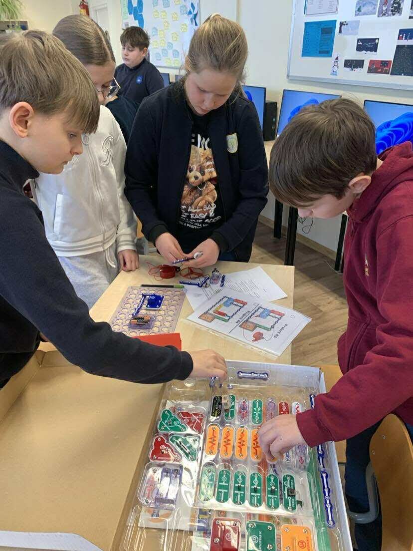 Pirmojoje užduotyje mokiniai, remdamiesi pateiktomis elektronikos schemomis, jungė elektros grandines.