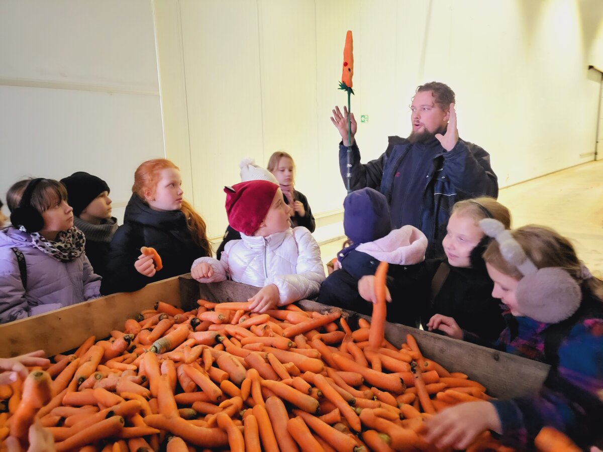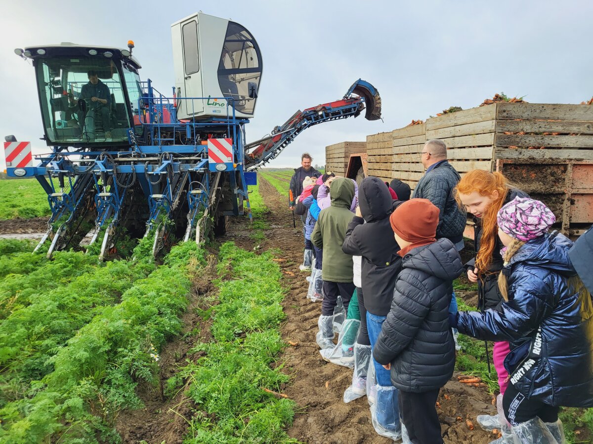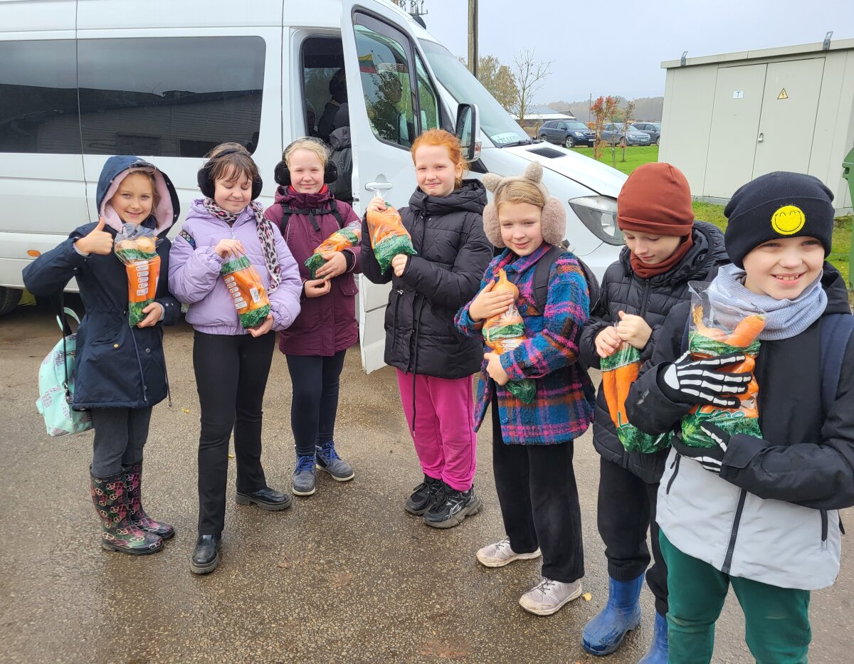 Po veiklų trečiokai išvyko į edukacinę kelionę „Sveikos daržovės – nuo lauko iki stalo“, kuri vyko Lino Šateikos daržininkystės ūkyje Daugėlaičių kaime. Mokiniai stebėjo daržovių derliaus nuėmimo procesą, matė, kaip morkos plaunamos, rūšiuojamos ir sandėliuojamos. Tai buvo ne tik pažintis su ūkininko darbu, bet ir puiki galimybė suprasti, kaip daržovės pasiekia mūsų stalą.