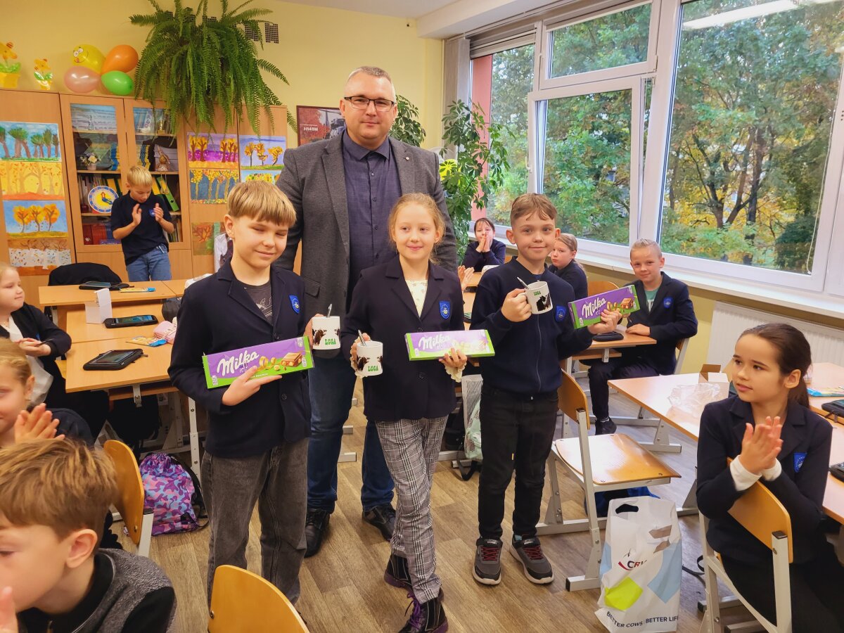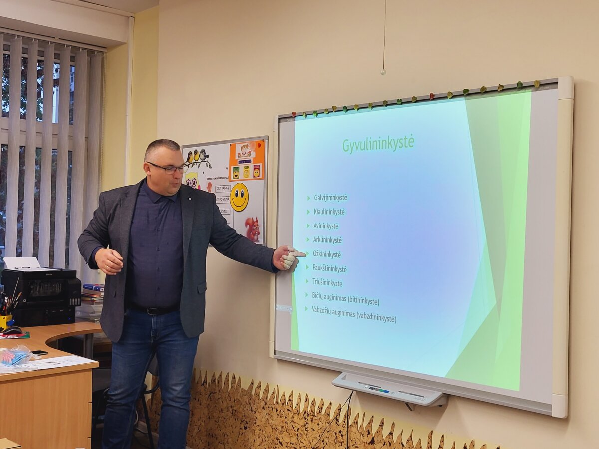 Šią ypatingą dieną suorganizavo trečiokės Evos šeima – Lina ir Darius Oberauskai, kurių iniciatyva mokiniai dalyvavo integruotoje gamtos mokslų ir matematikos pamokoje „Gyvulių pasaulis – ką augina ūkininkai?“. Pamokos metu Darius Oberauskas mokiniams pristatė galvijų veisles, papasakojo apie mėsinės gyvulininkystės ypatumus. Vaikai ne tik klausėsi, bet ir aktyviai įsitraukė – sprendė praktines užduotis, dalyvavo interaktyvioje „Kahoot“ viktorinoje, varžėsi žiniomis ir smagiai leido laiką. Pamokos pabaigoje jų laukė maloni staigmena – už pastangas, smalsumą ir aktyvumą visi buvo apdovanoti saldžiomis ir naudingomis dovanėlėmis: „Milka“ šokoladais, LGGA puodeliais, rašymo priemonėmis, „Pik-Nik“ sūrio lazdelėmis ir saldainiais „Karvutė“. Džiaugsmo netrūko nei akyse, nei kuprinėse!